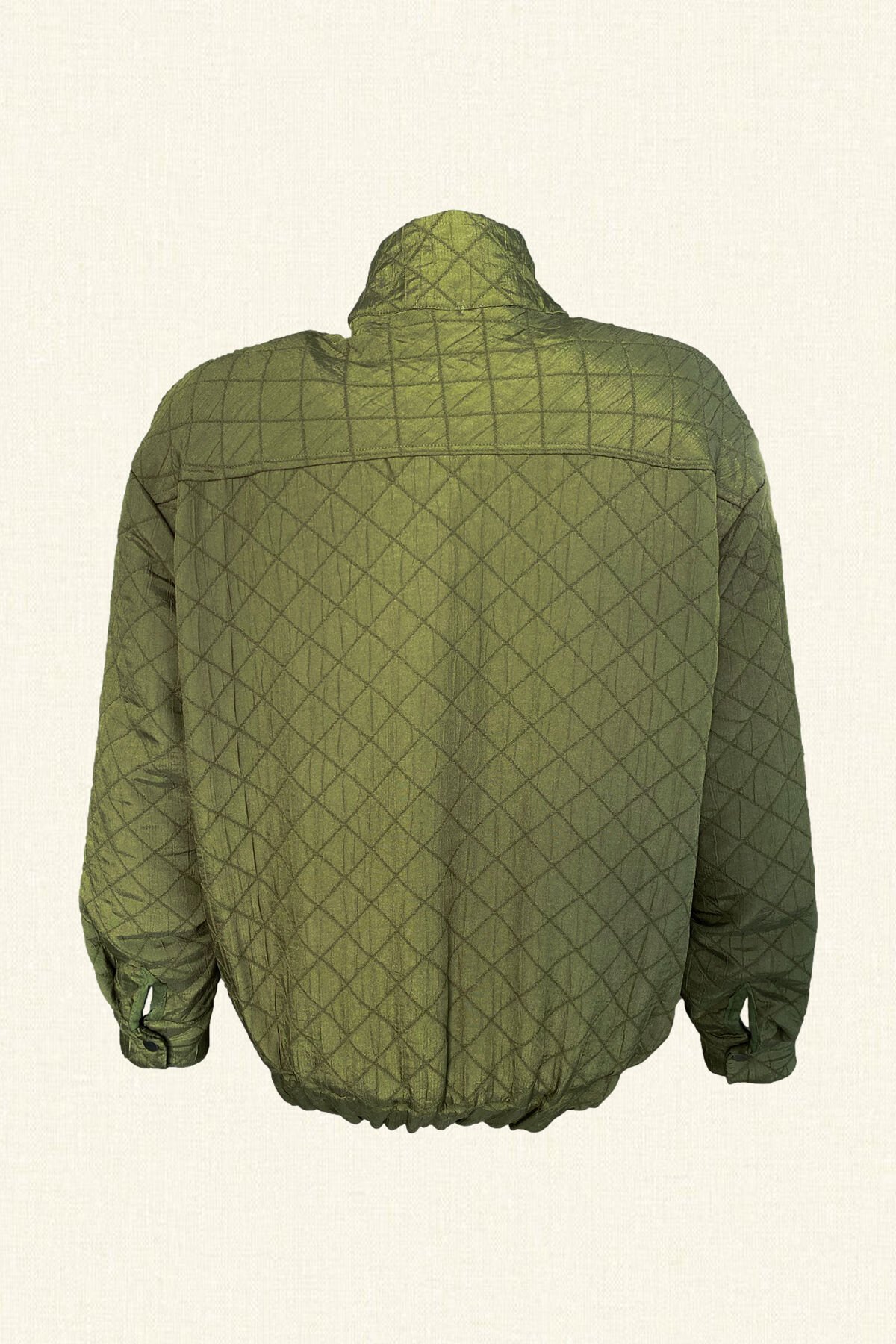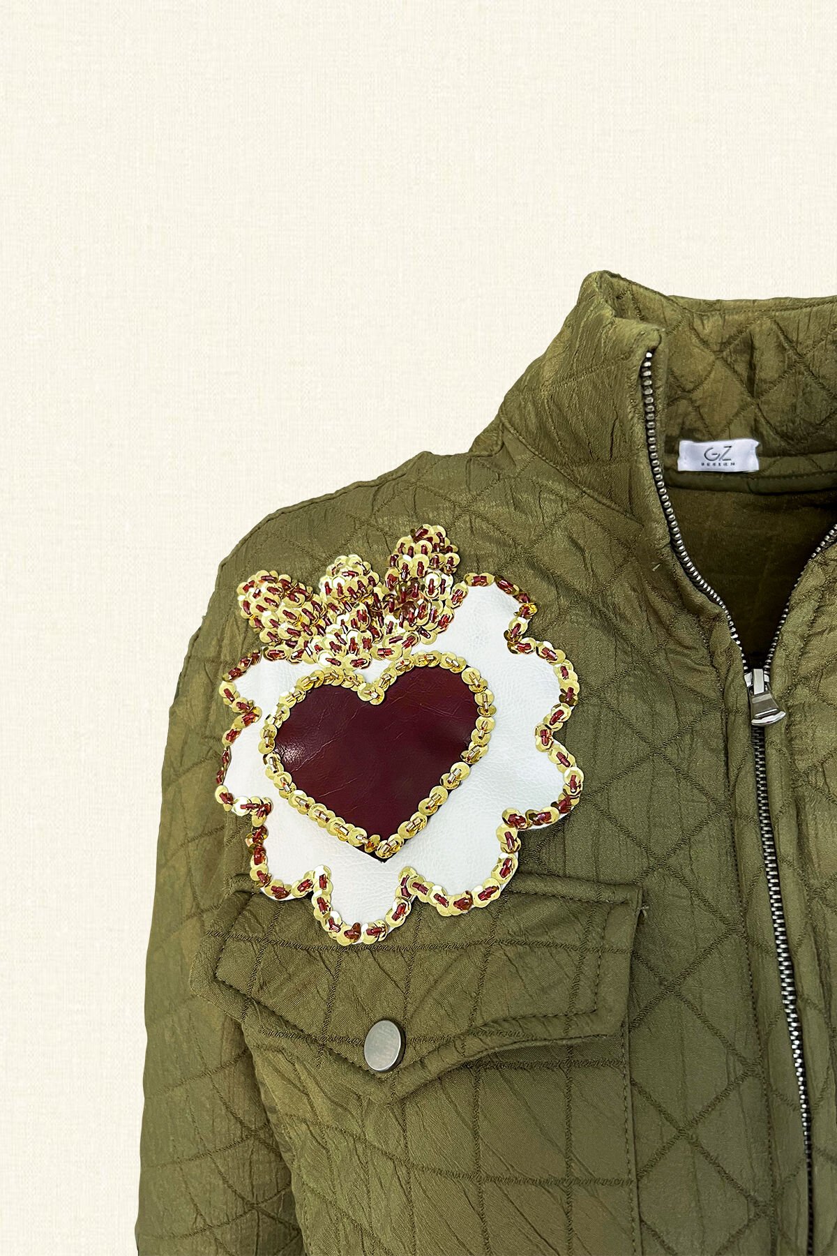 Ön kısmında beyaz deri üzerine bordo deri kalp bulunan, kenarları boncuk ve pullarla işlenmiş, fermuarlı, yeşil renk kapitone bomber ceket.
