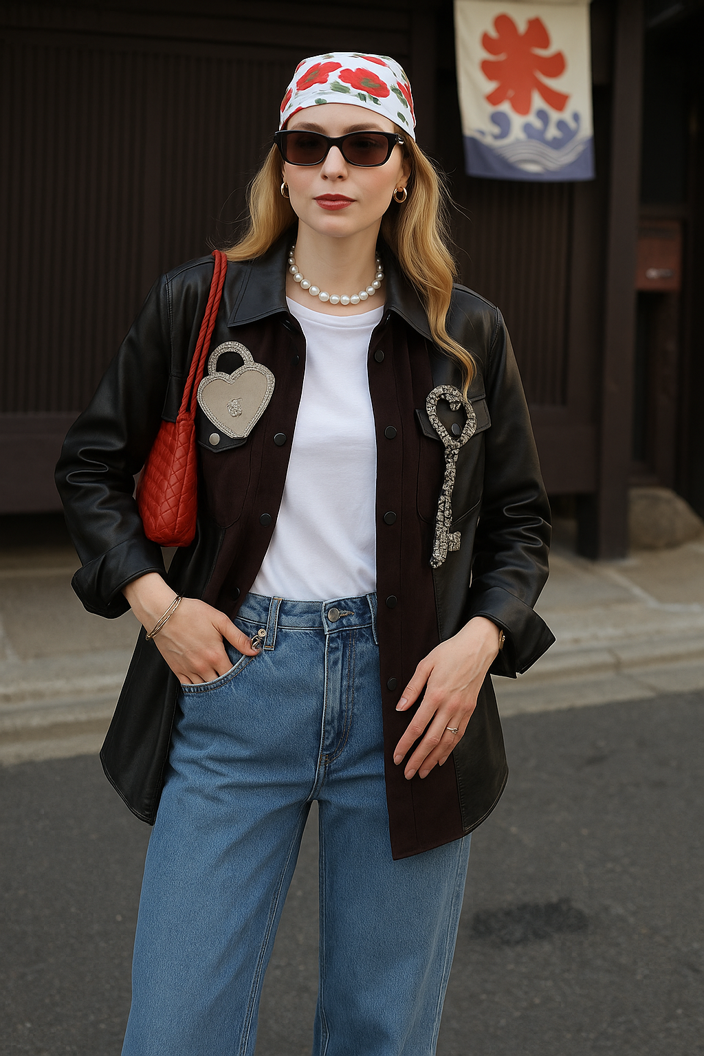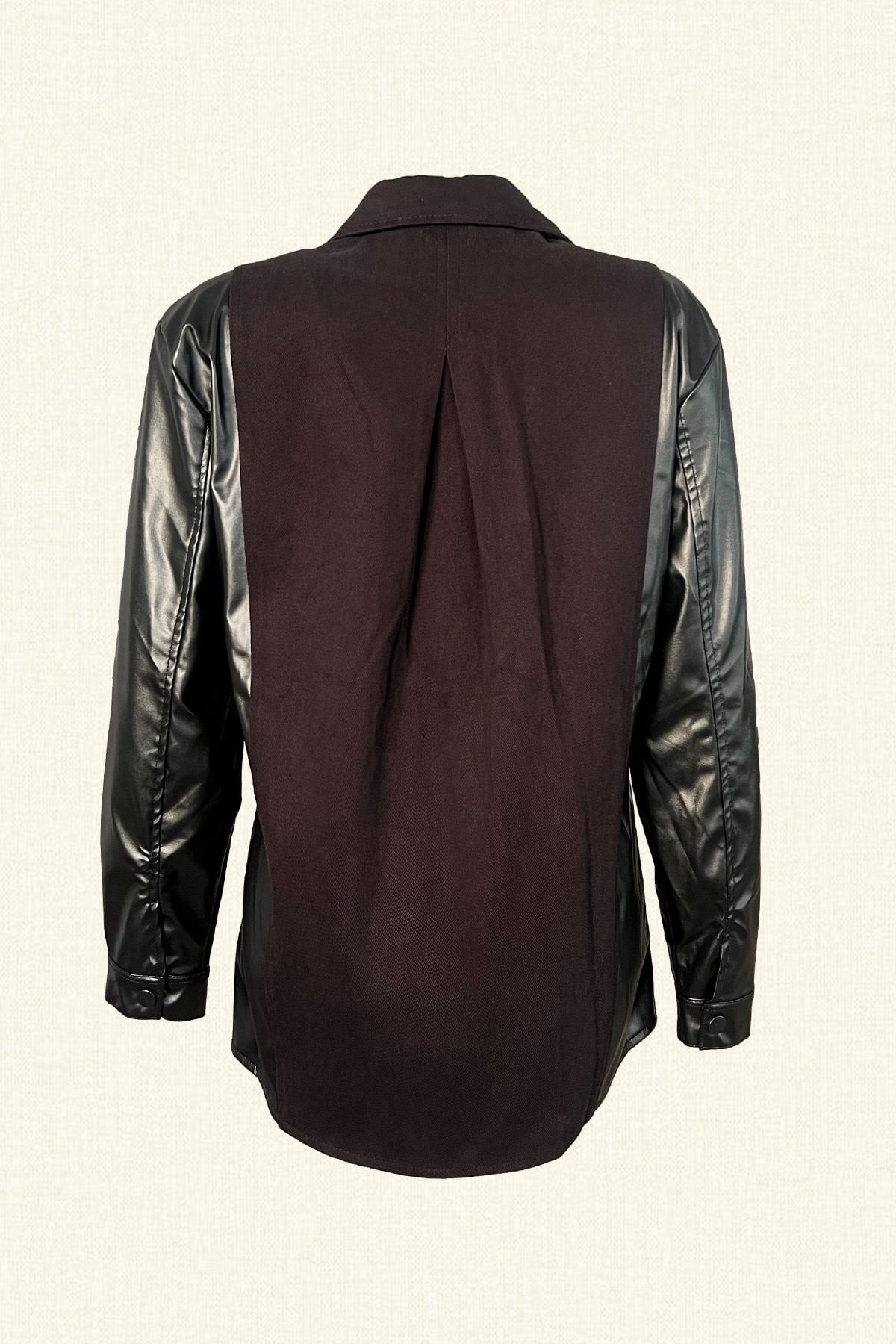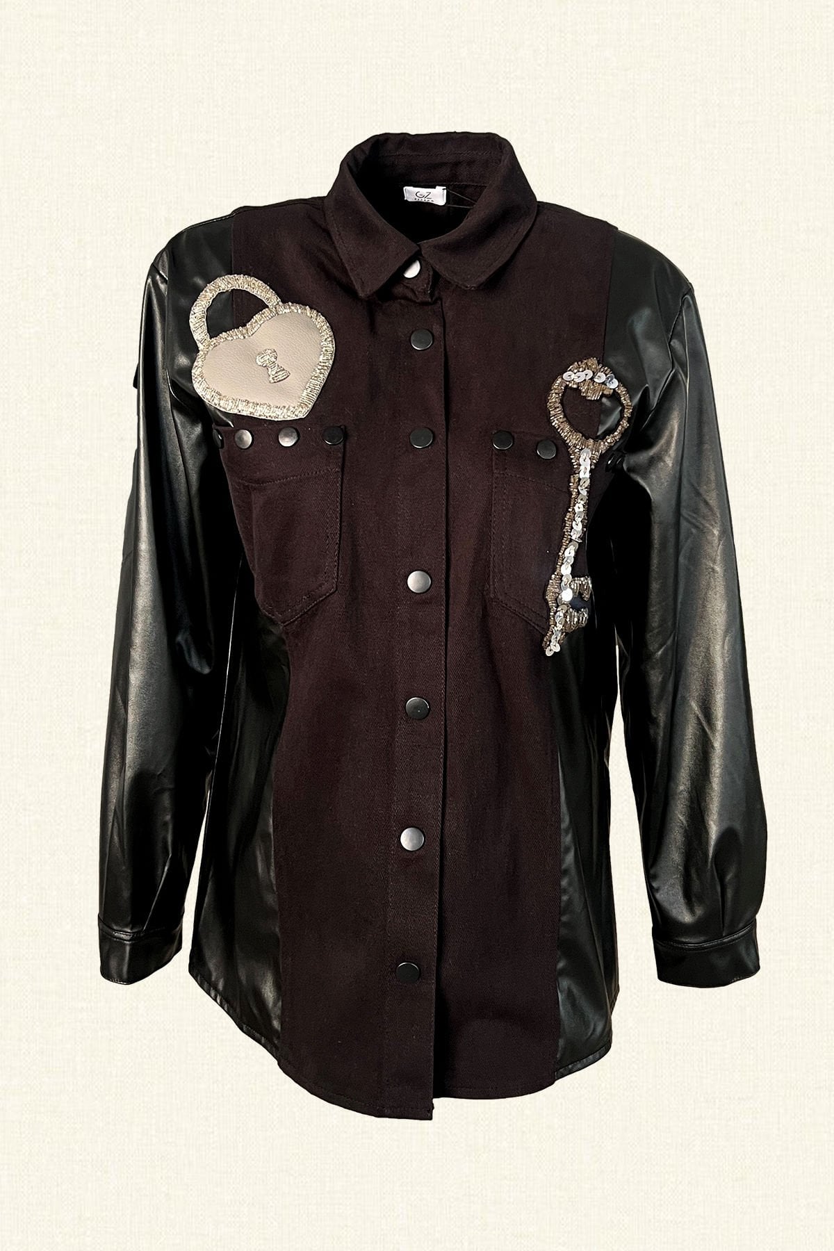 Deri Üzeri Anahtar Motifi İşlemeli Kolları Deri Detaylı Siyah Jean Ceket