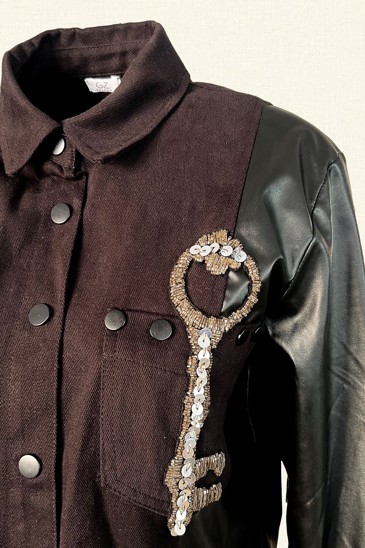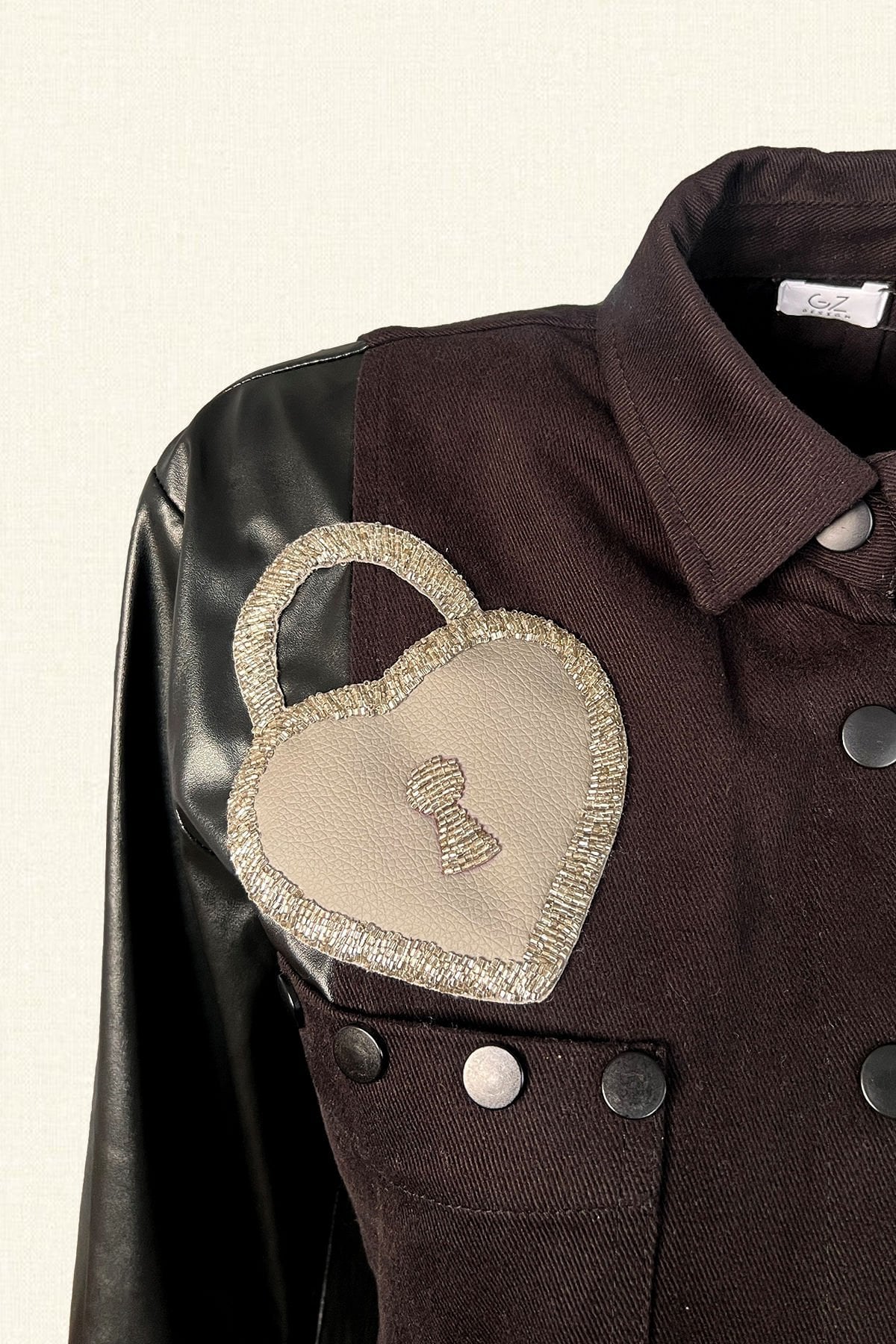 Kolları deri detaylı, gri deri motifi üzerine gümüş kristal boncuklardan kilit işleme detaylı bulunan siyah jean ceket.