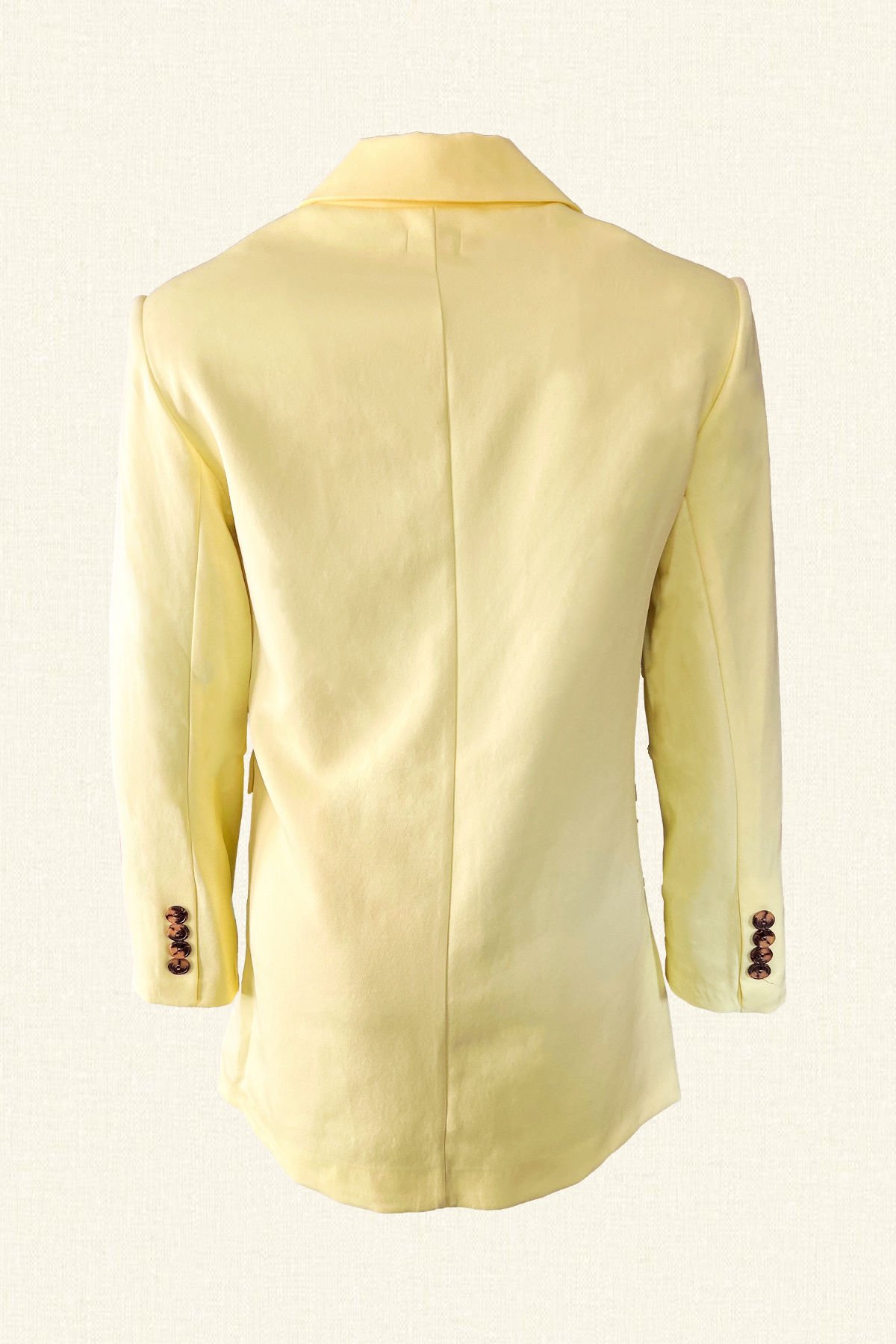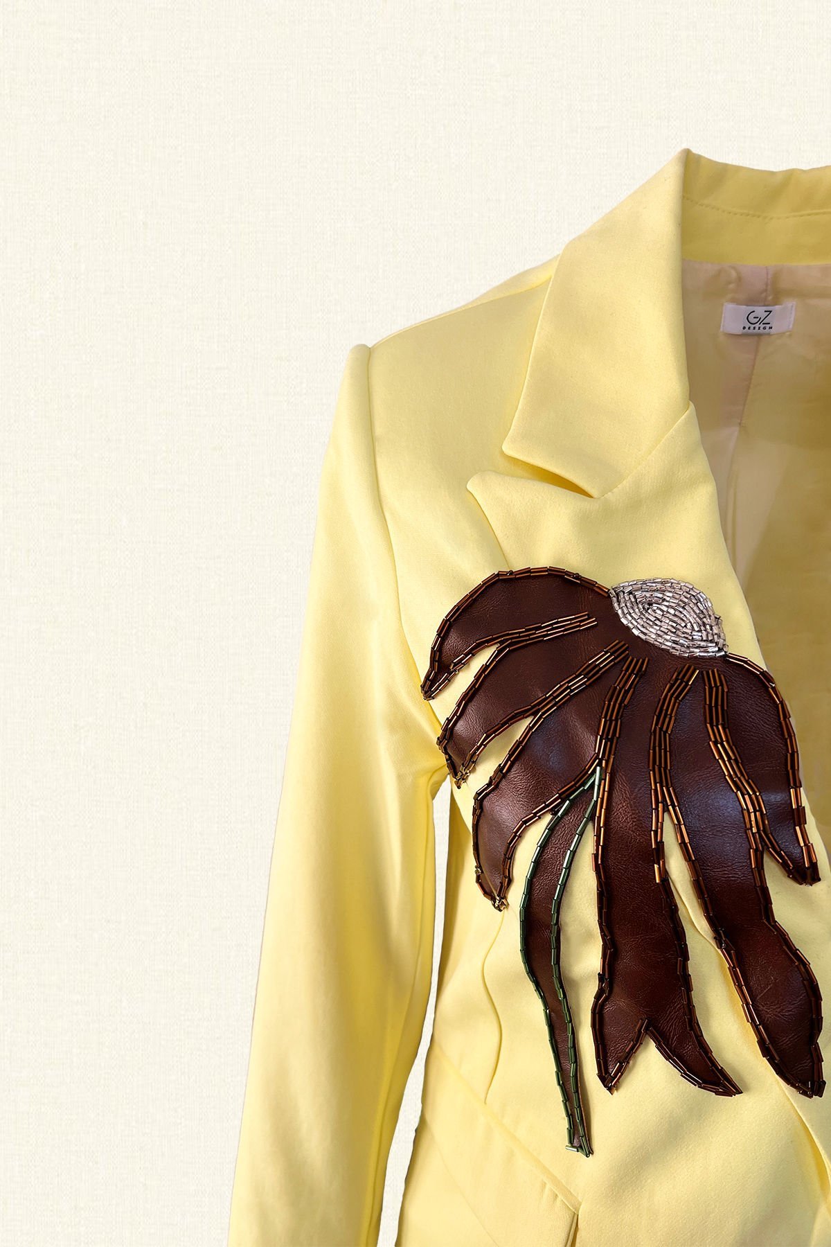Ön kısmında kahverengi deri üzeri boncuklardan işlemesi bulunan, çiçek figürlü tek düğme detayı bulunan sarı renk uzun blazer ceket.