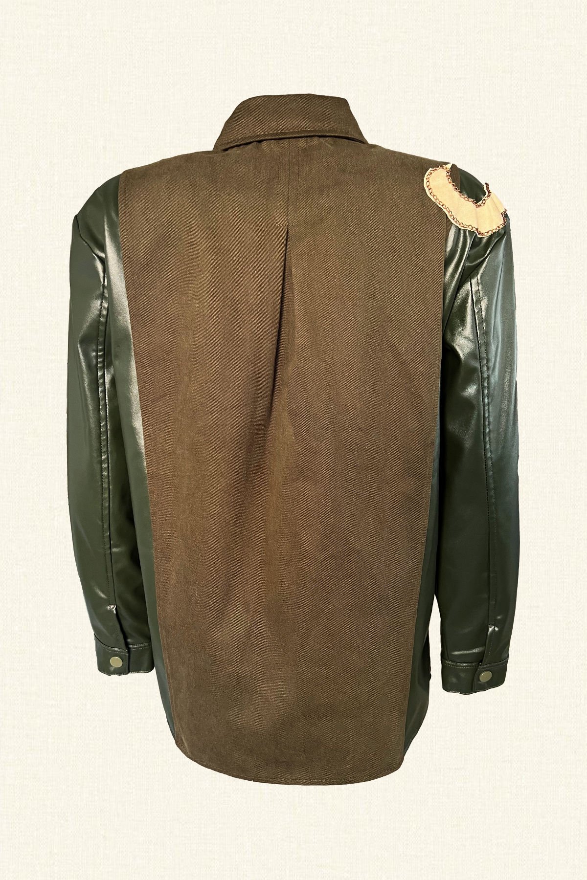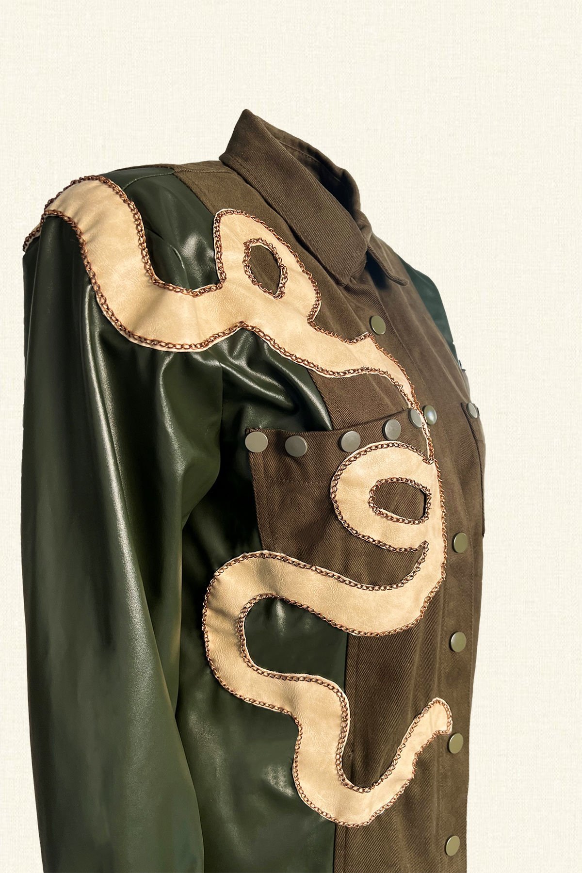 Kolları deri detaylı, ön kısmından omuzuna kadar deri üzerine bakır zincirli yeşil renk jean ceket.
