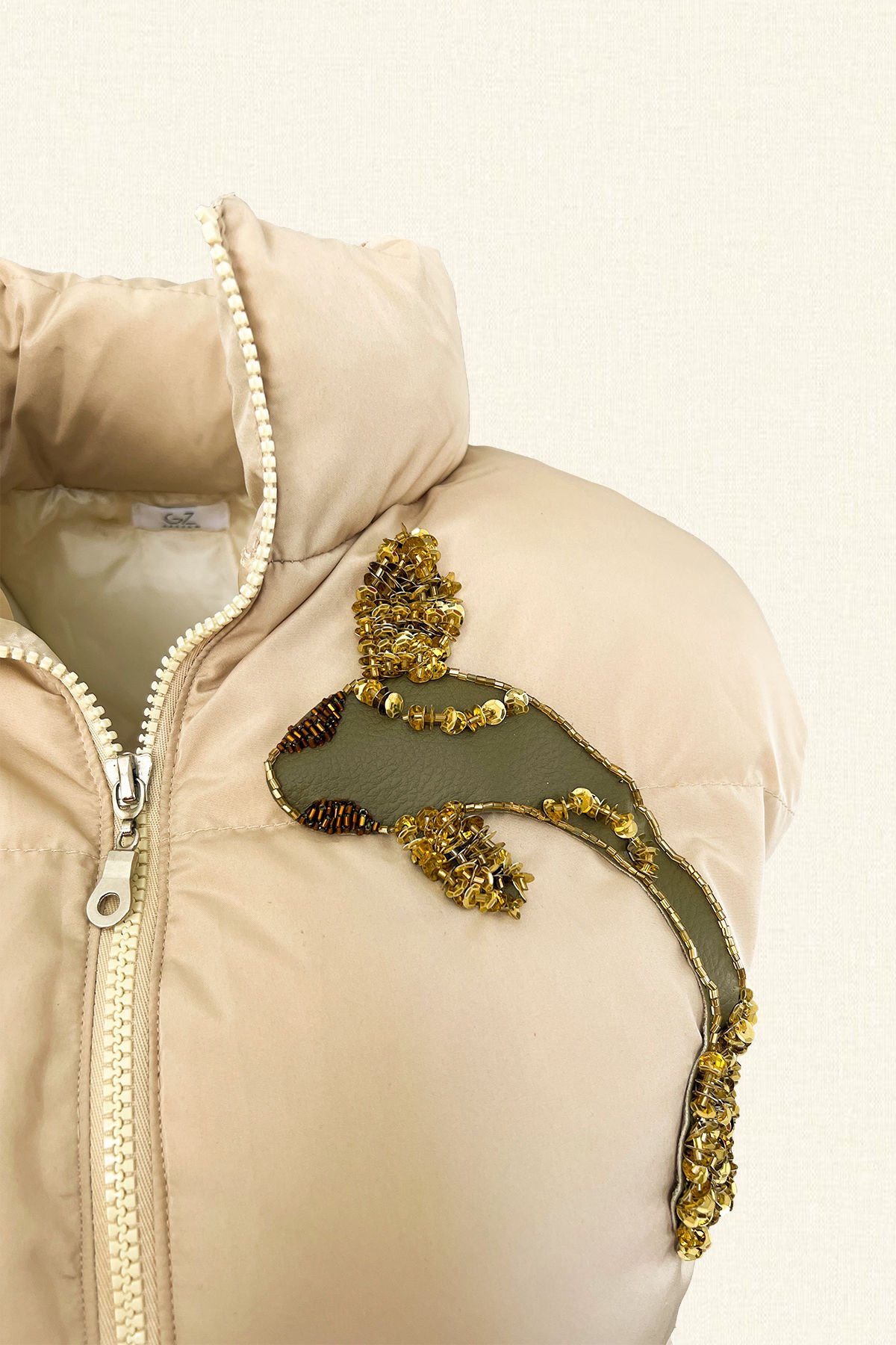 Ön kısmında deri üzerine gold pul ve boncuklardan balık işlemeli krem bomber, şişme yelek.
