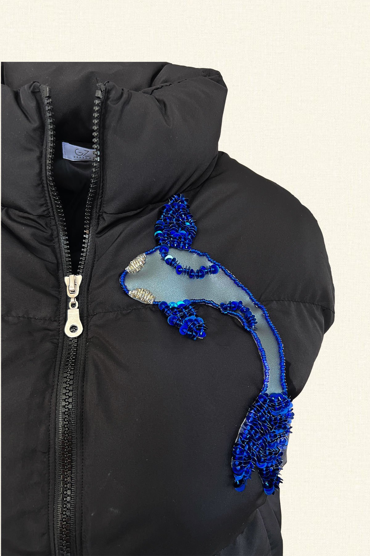 Ön kısmında deri üzerine mavi pul ve boncuklardan balık işlemeli siyah bomber, şişme yelek.