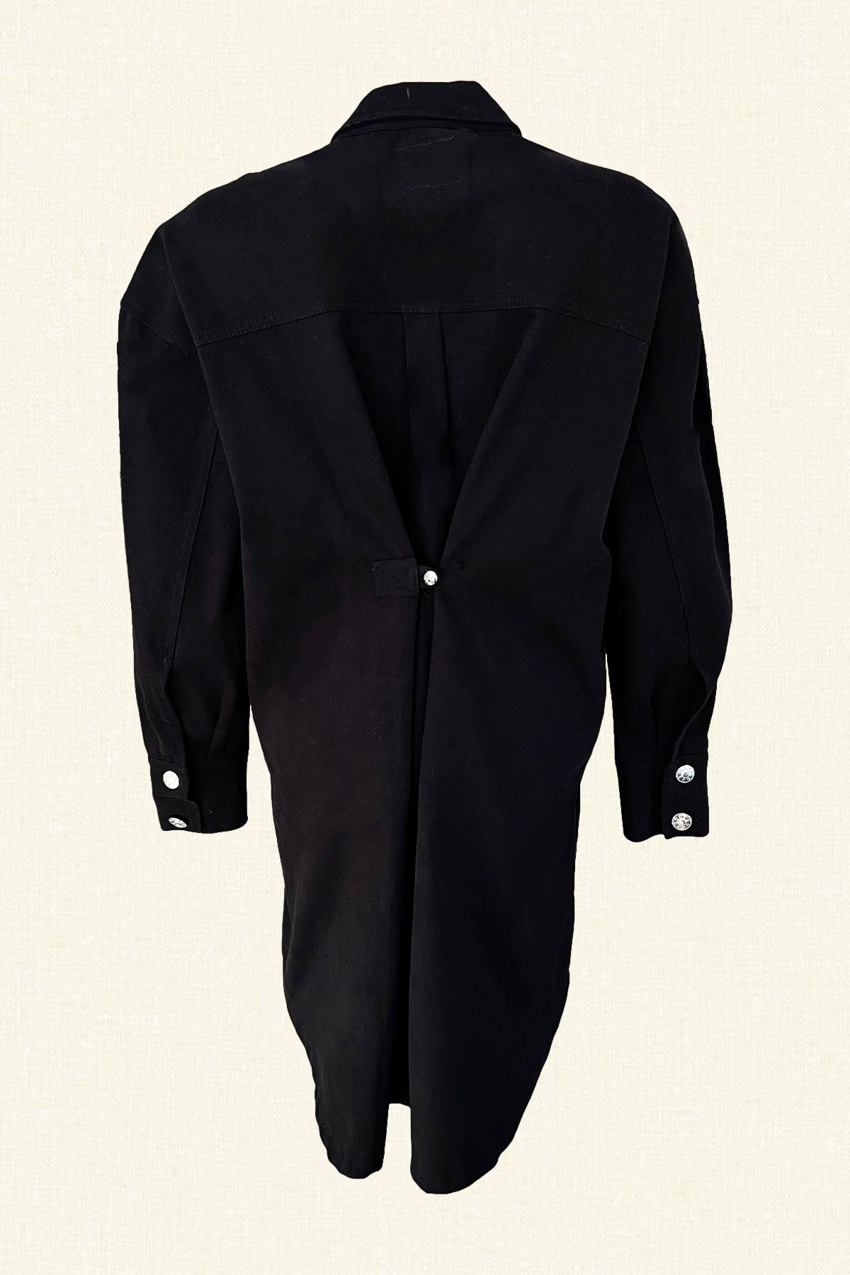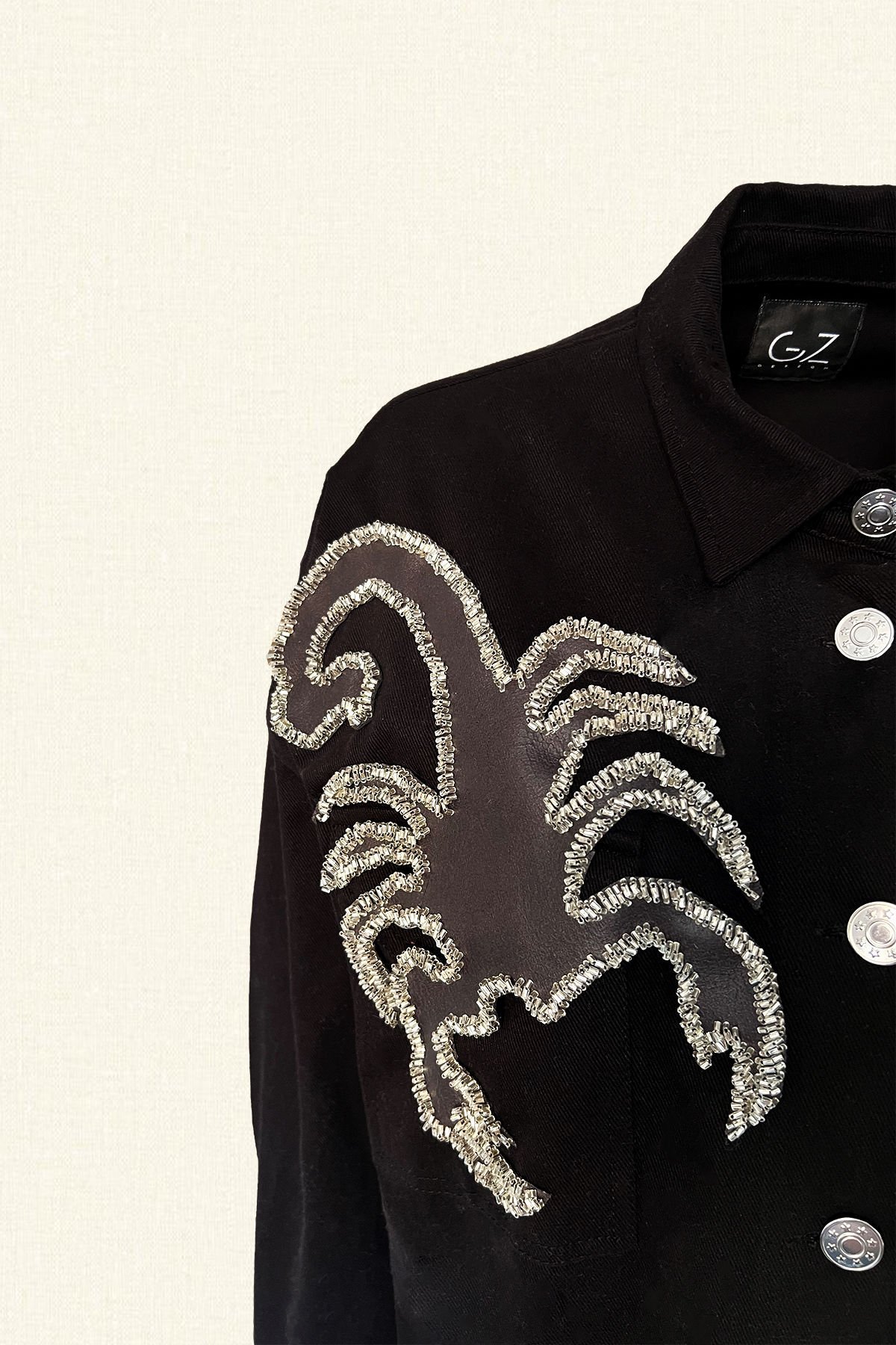 Ön kısmında siyah deri üzerine gümüş boncuklardan akrep işlemesi bulunan, arka kısmında düğme detaylı uzun siyah renk jean ceket.
