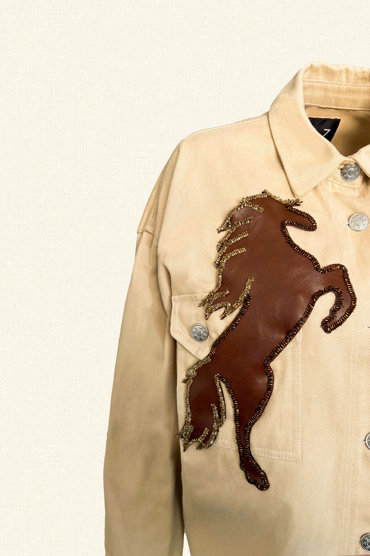Ön kısmında kahverengi deri üzerine boncuklardan at işlemesi bulunan, arka kısmında düğme detayı bulunan uzun krem jean ceket.