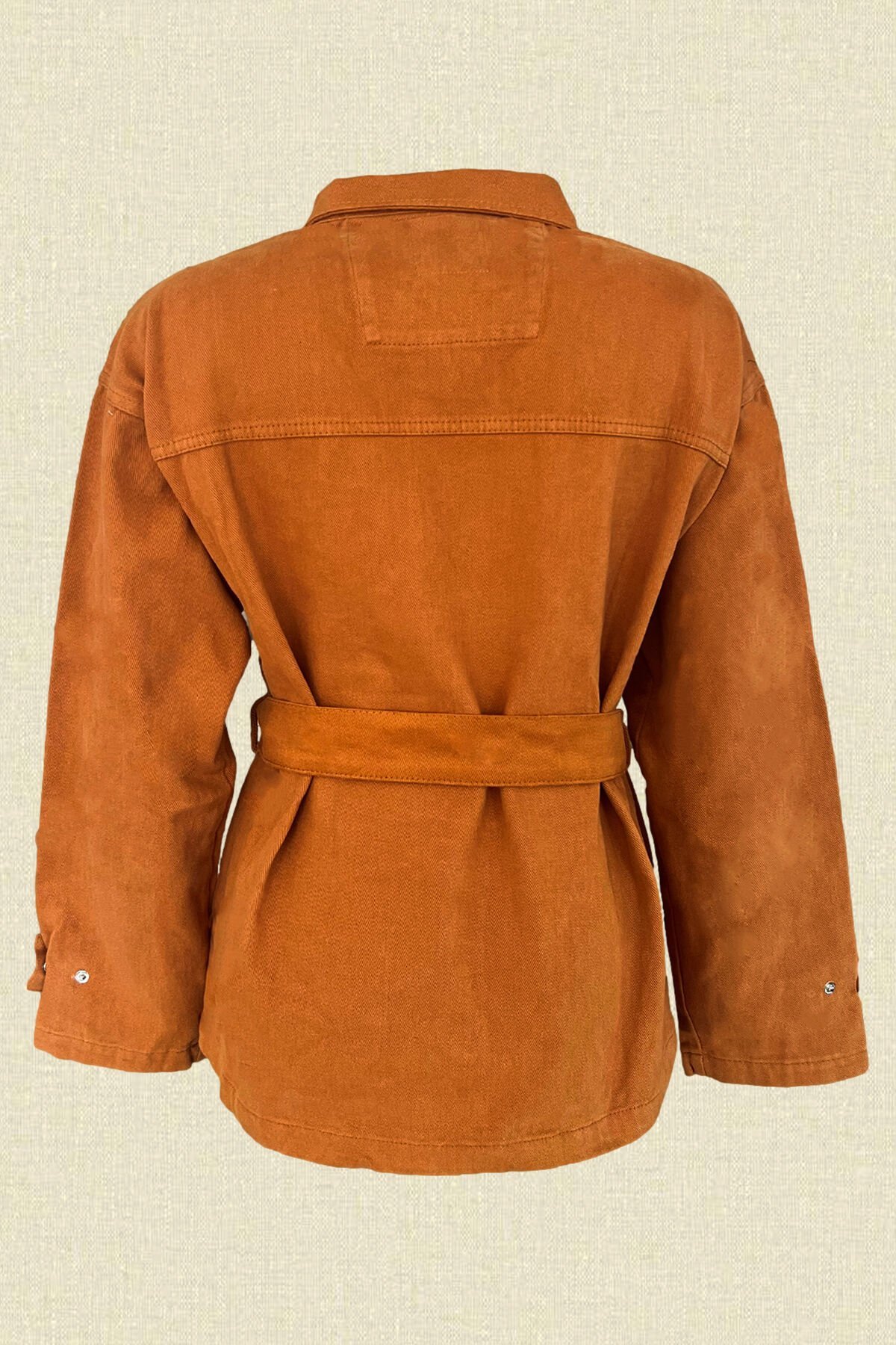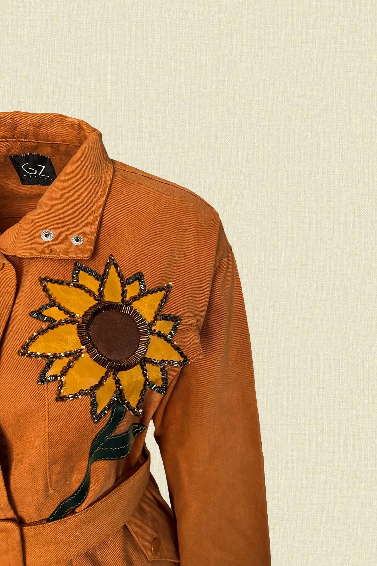 Ön kısmında deri üzerine boncuklardan ayçiçeği işlemesi bulunan, kiremit renk, kemer detaylı jean ceket.