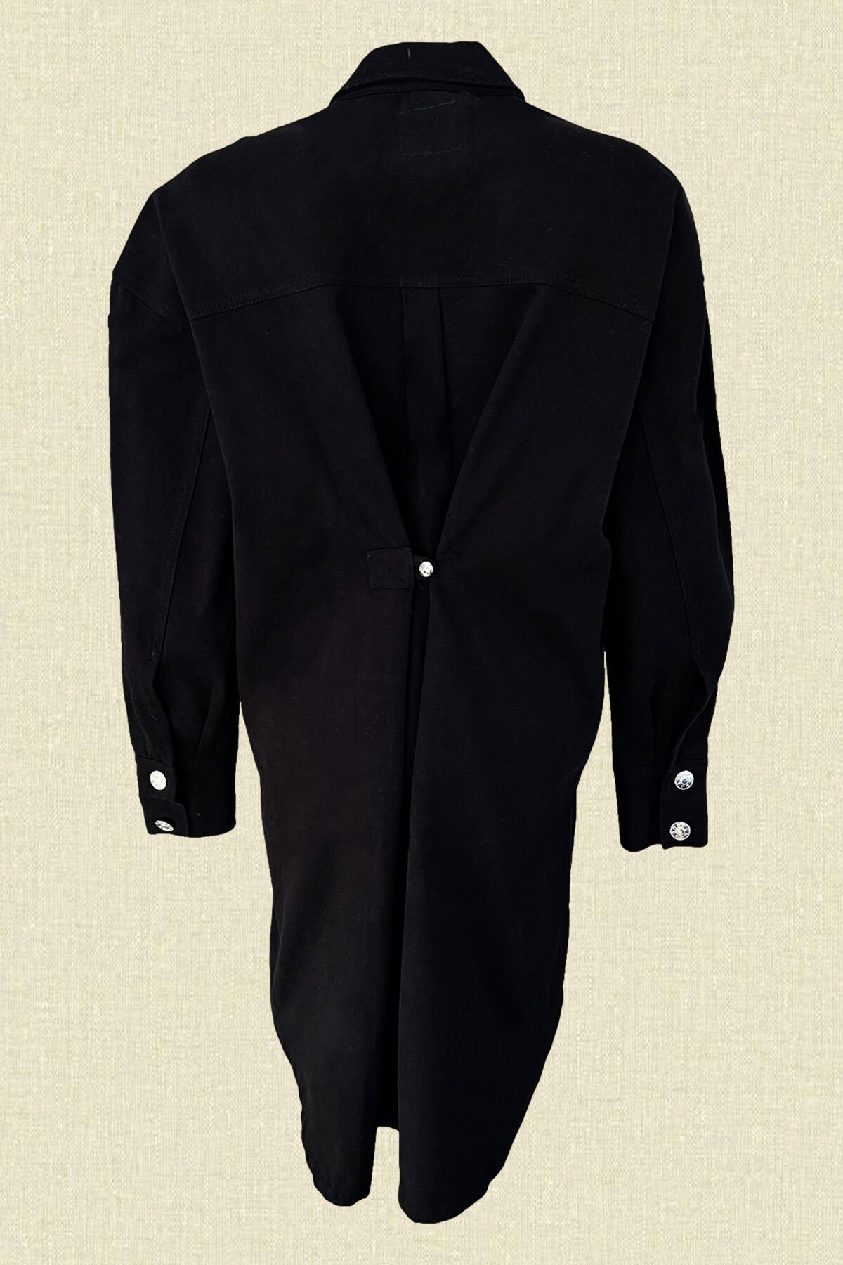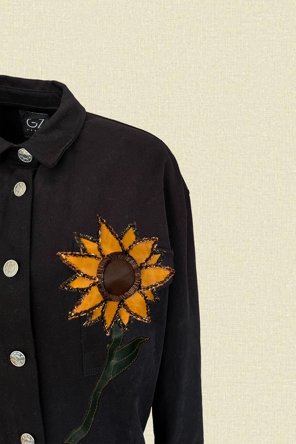Ön kısmında deri üzerine boncuklardan ayçiçeği işlemesi bulunan, arka kısmında düğme detayı bulunan siyah jean ceket.