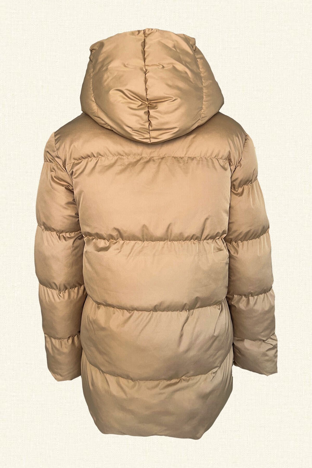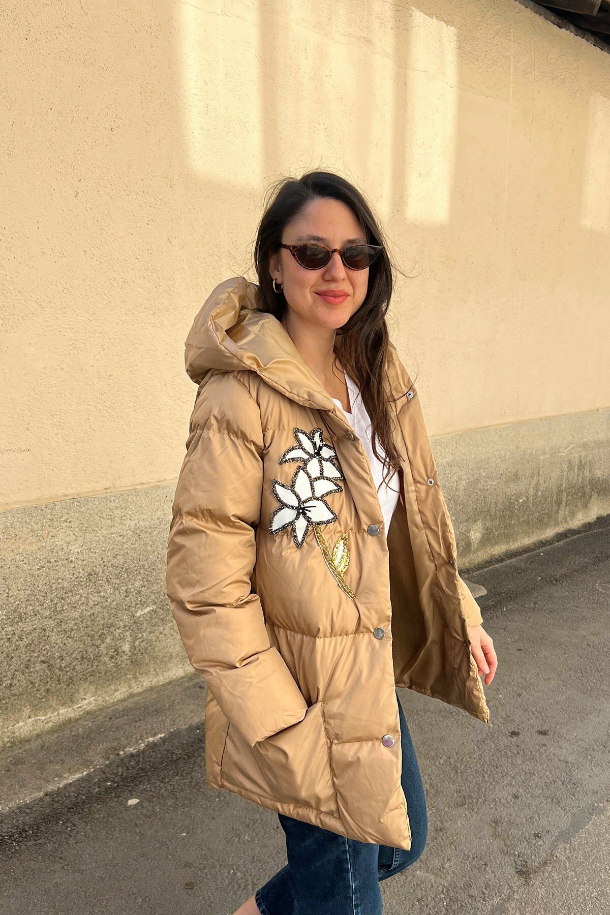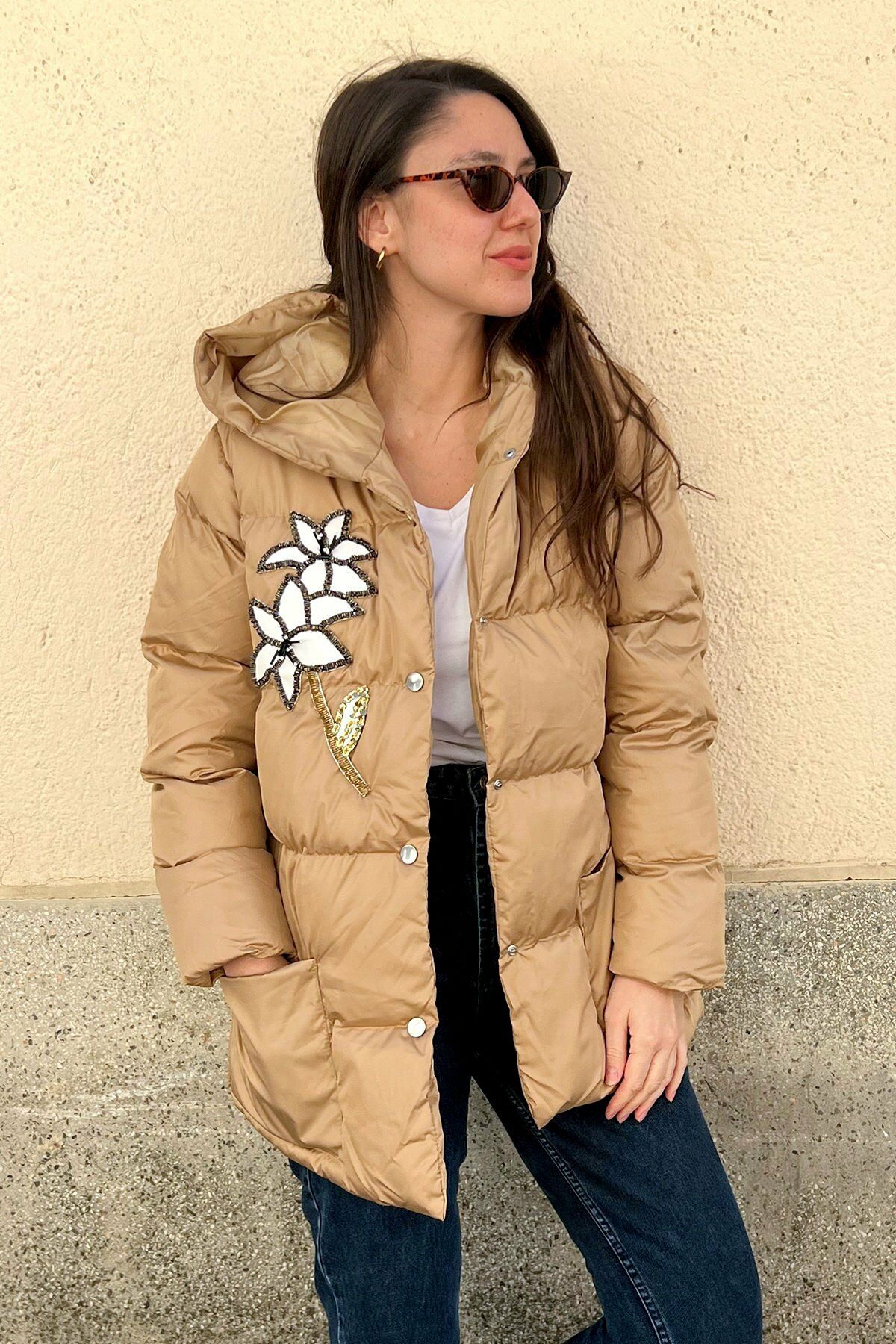 Ön kısmında beyaz deri üzeri boncuk işlemeli, çiçek figürü bulunan, kapüşonlu, çıt çıt kapamalı, krem şişme mont.