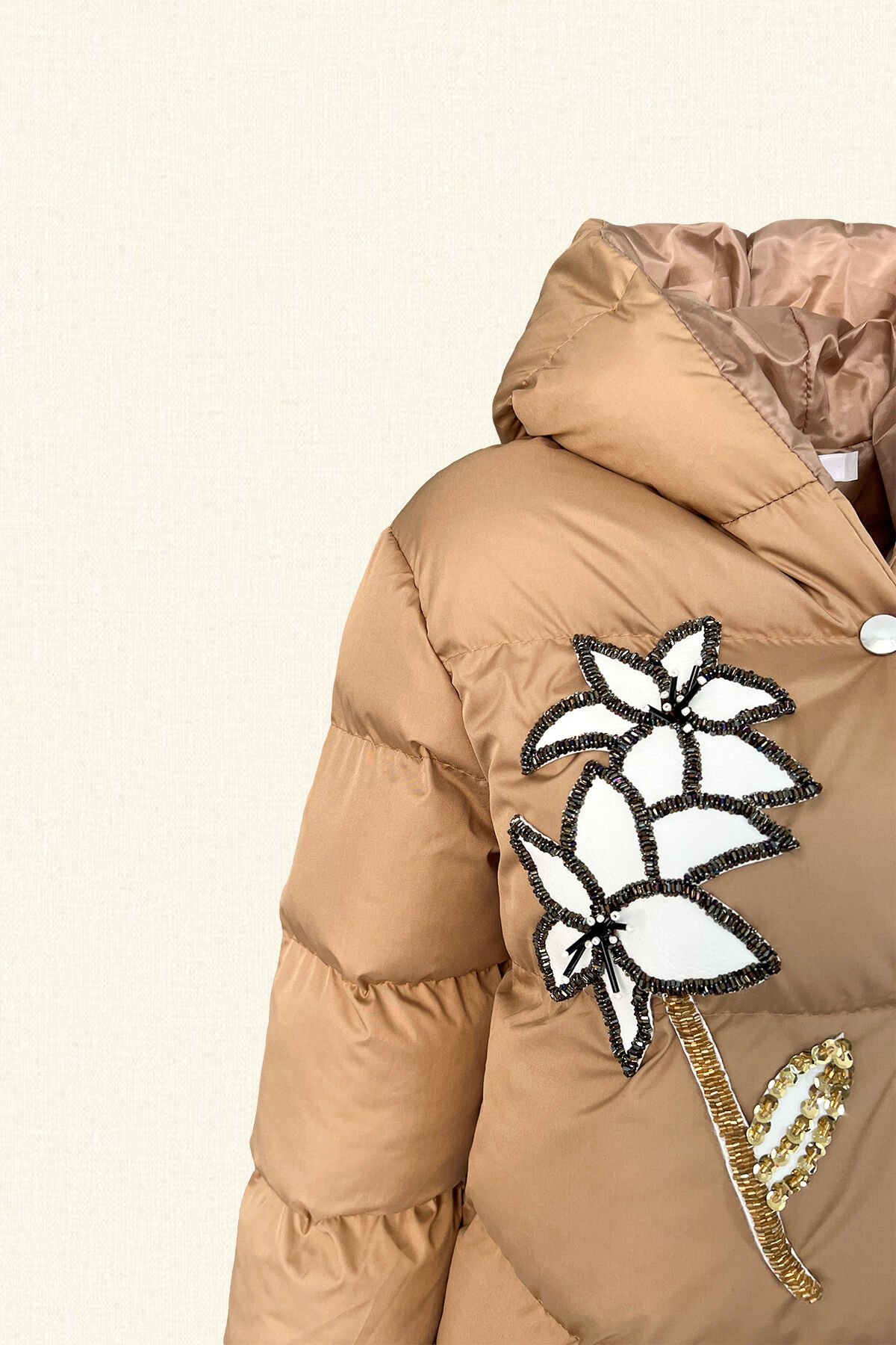 Deri Üzeri Boncuk İşlemeli Çiçek Figürlü Krem Şişme Mont