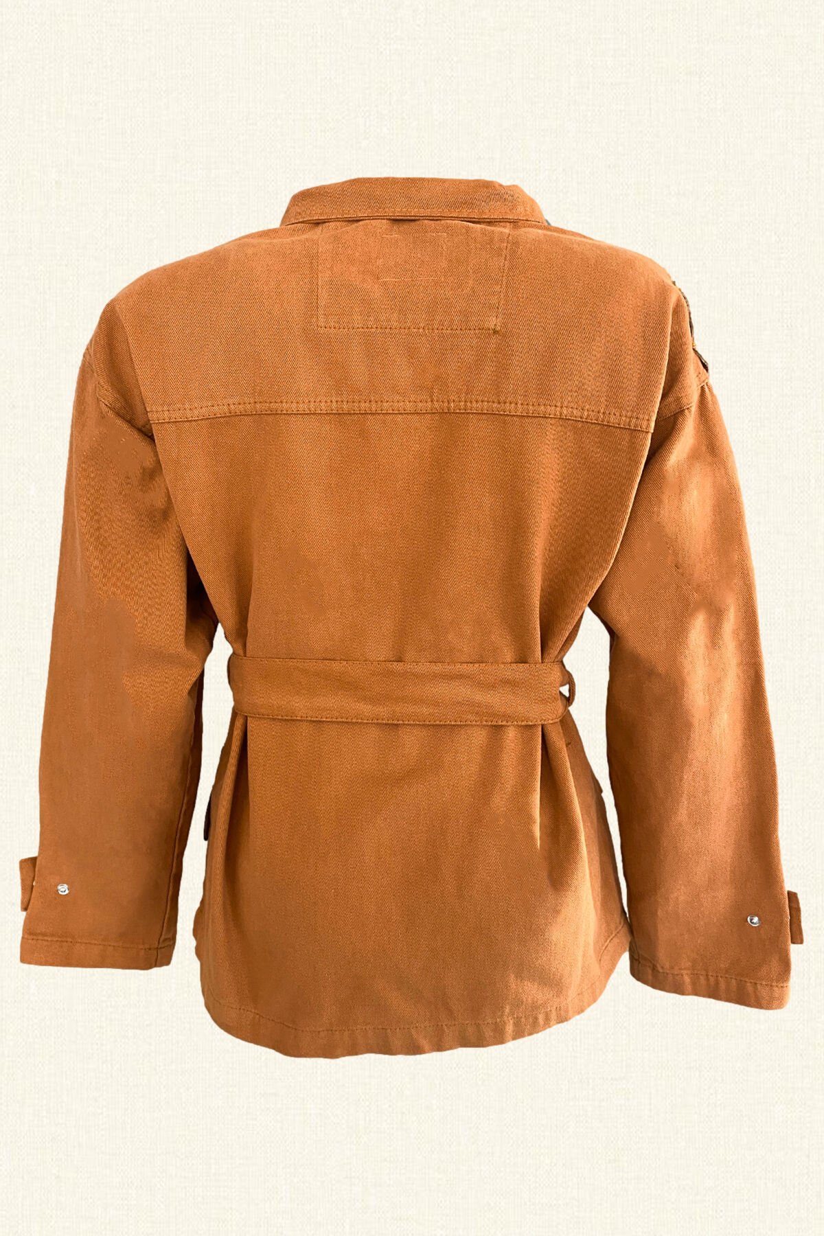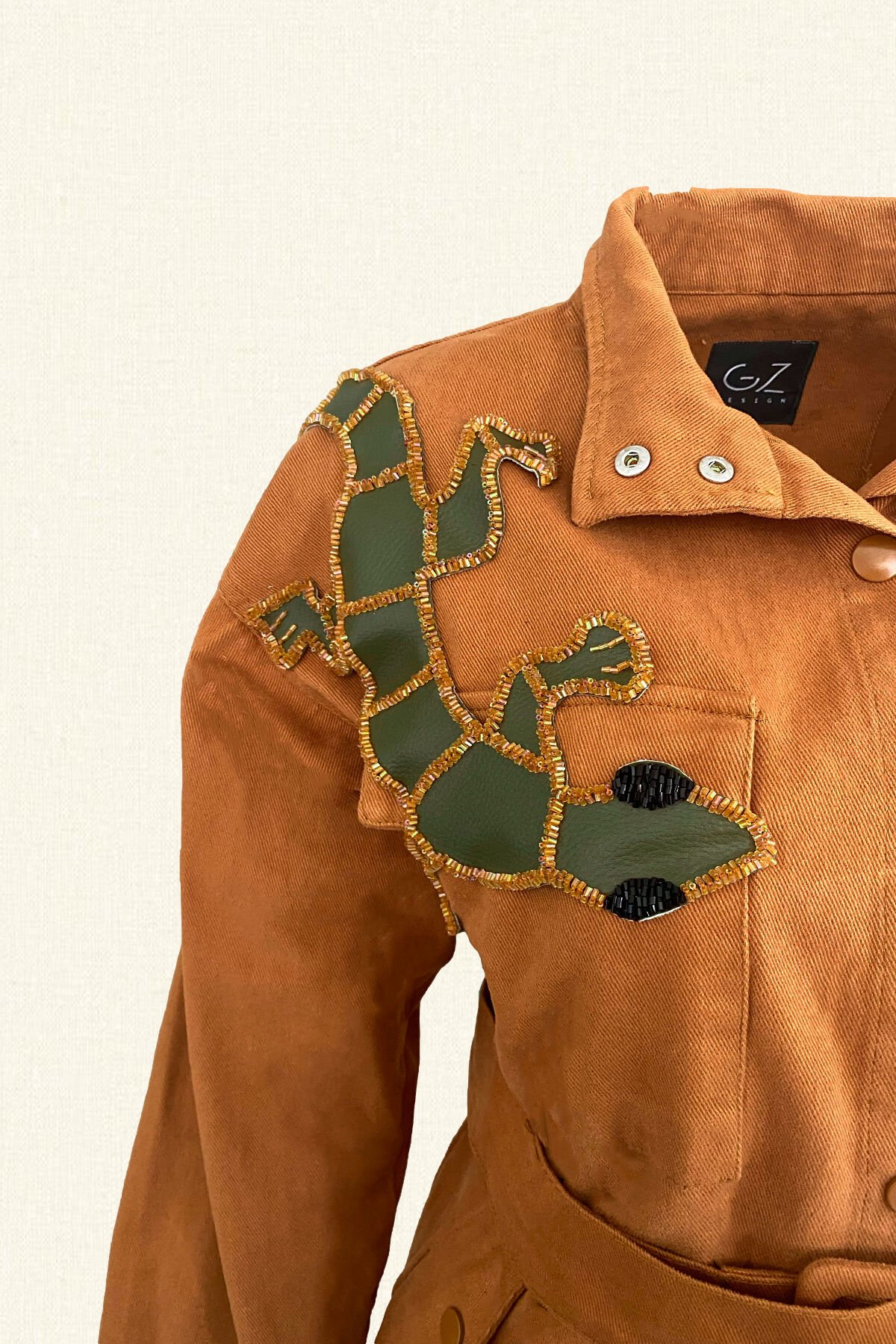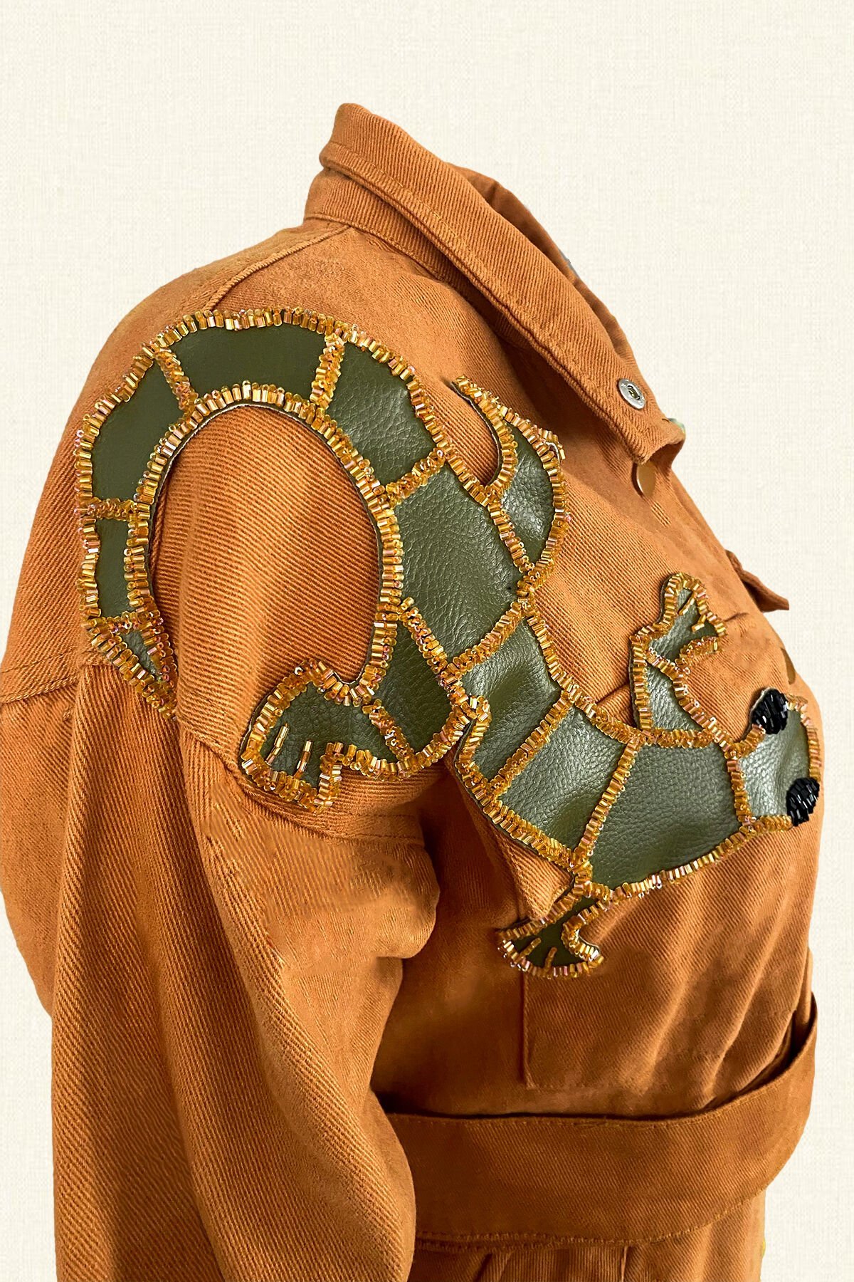 Omuzdan ön kısmına doğru gelen boncuk ve pullardan kertenkele işlemeli, beli kemer detaylı, kiremit renk jean ceket.