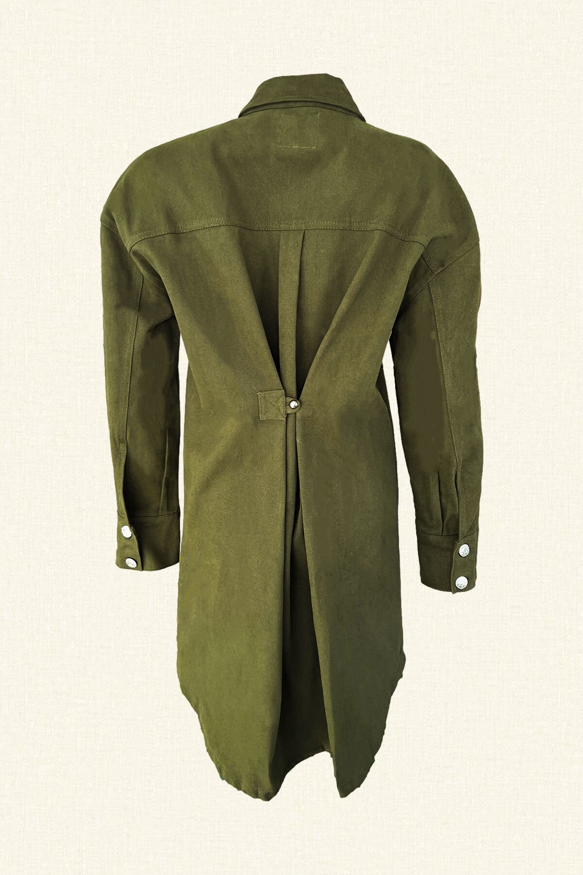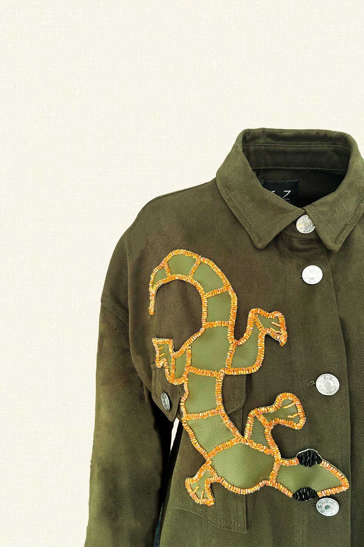 Ön kısmında yeşil deri üzerine boncuklardan kertenkele işlemesi bulunan, arka kısmında düğme detayı bulunan uzun yeşil jean ceket.
