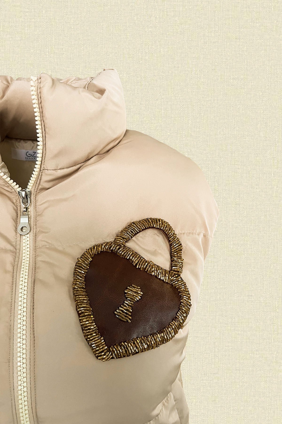Ön kısmında kalp şeklinde deri üzerine boncuklardan kilit figürü bulunan, bomber krem şişme yelek.