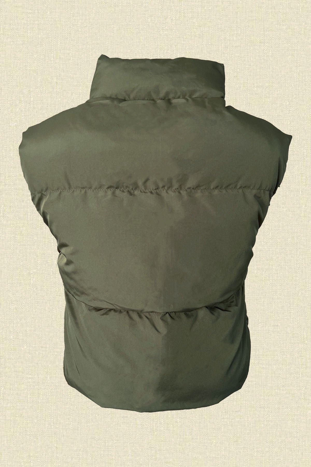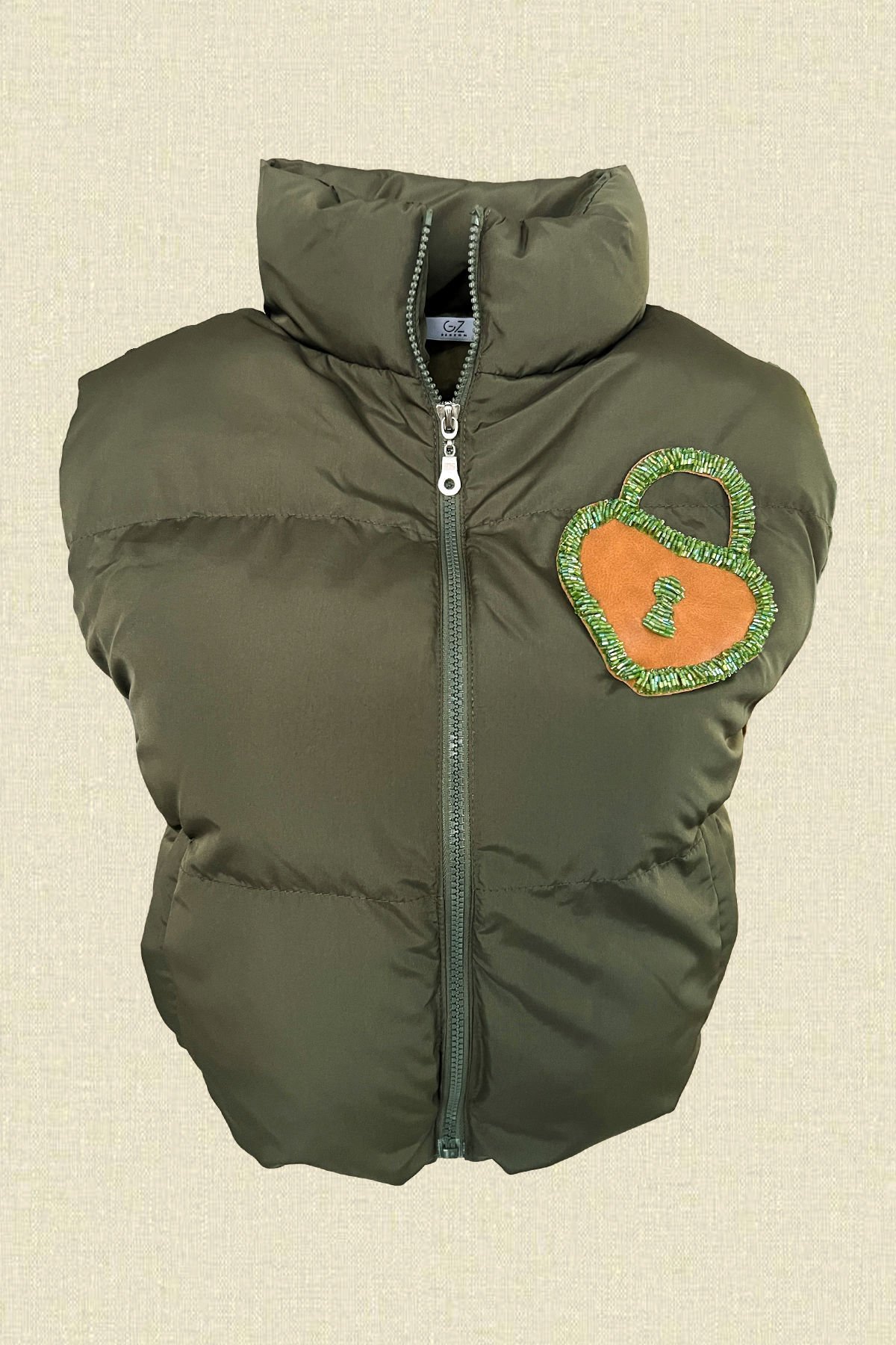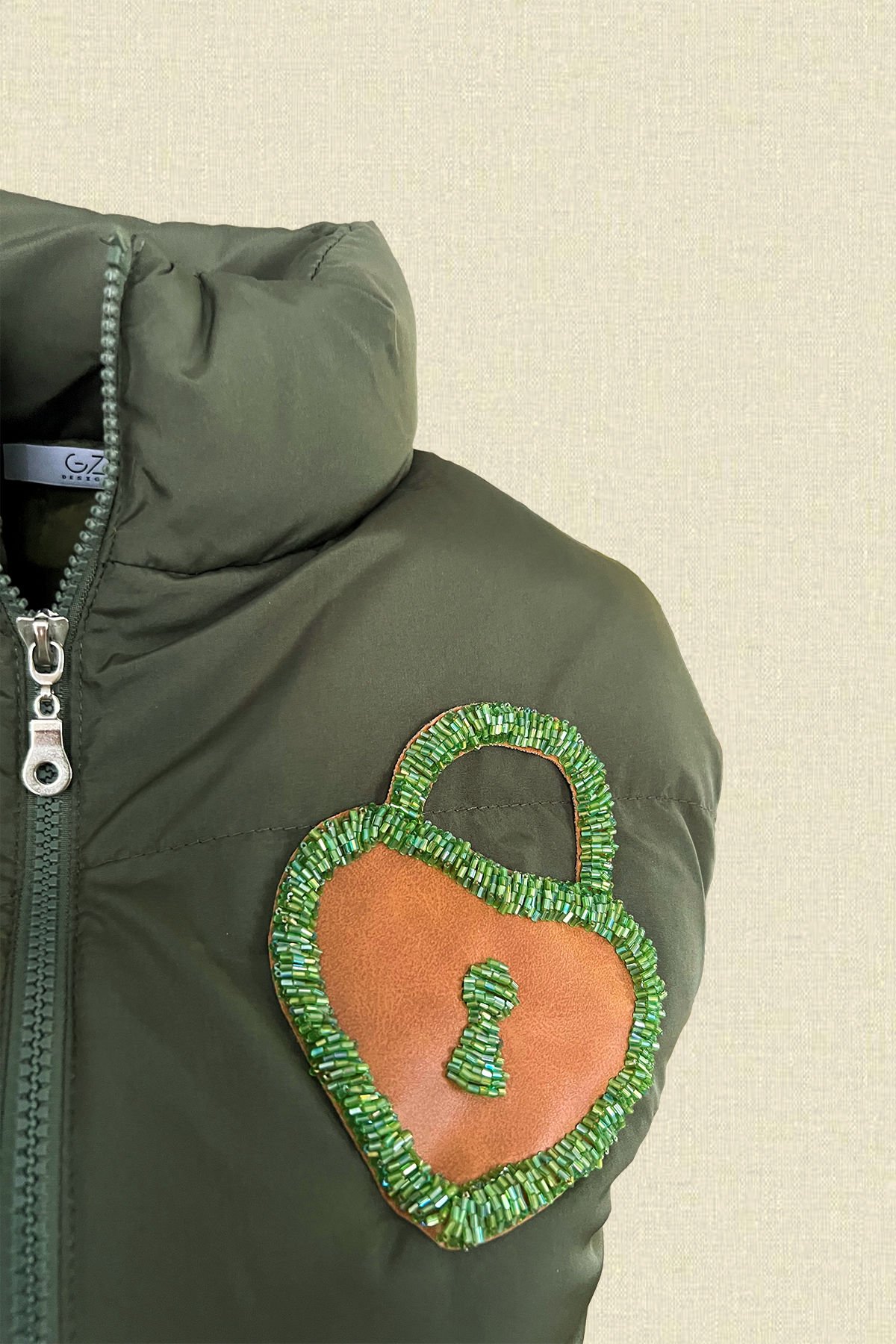 Ön kısmında kalp şeklinde deri üzerine boncuklardan kilit figürü bulunan, bomber yeşil şişme yelek.
