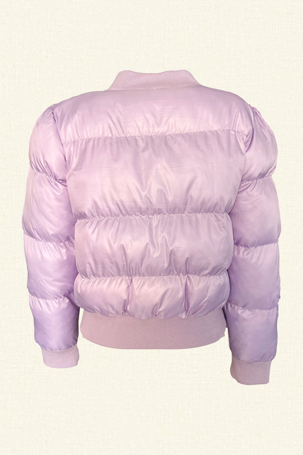 Ön kısmında lila renk boncuk işlemeli, beli ve kolları lastikli, lila renk şişme mont.