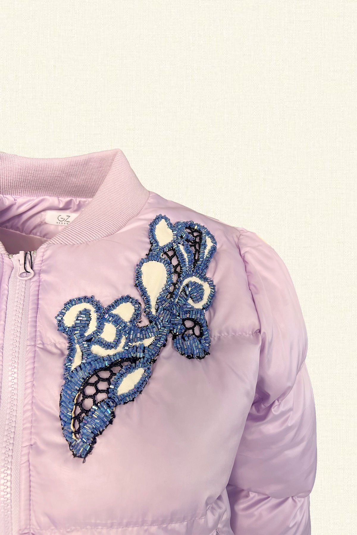 Deri Üzeri Boncuk İşlemeli Lila Renk Şişme Mont