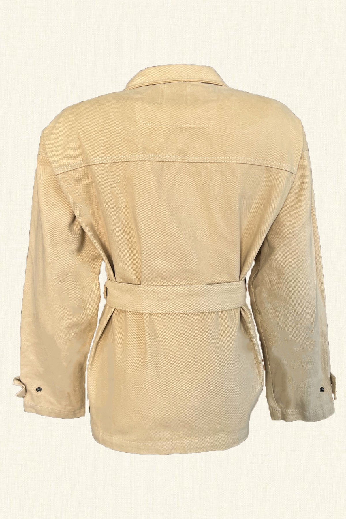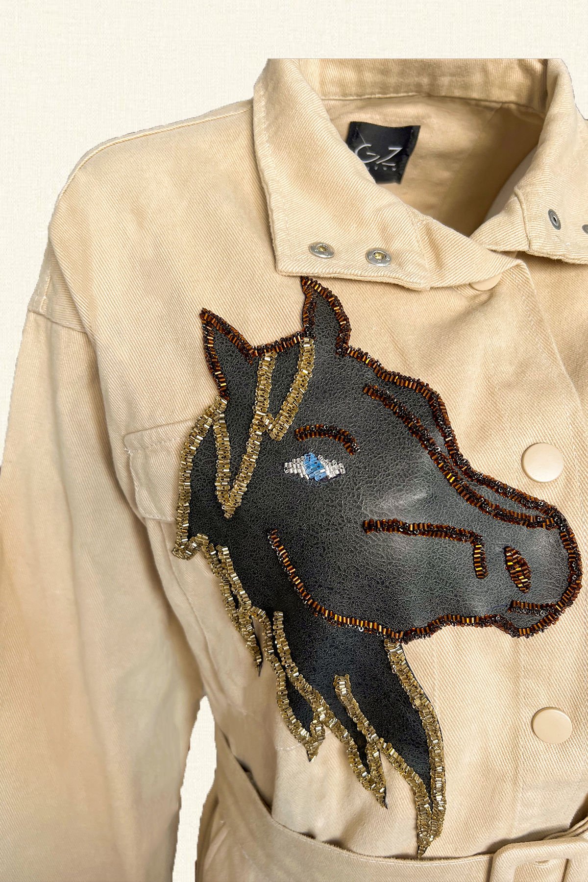 Ön kısmında deri üzerine boncuklardan mavi gözlü at işlemesi bulunan, krem renk, kemer detaylı jean ceket.