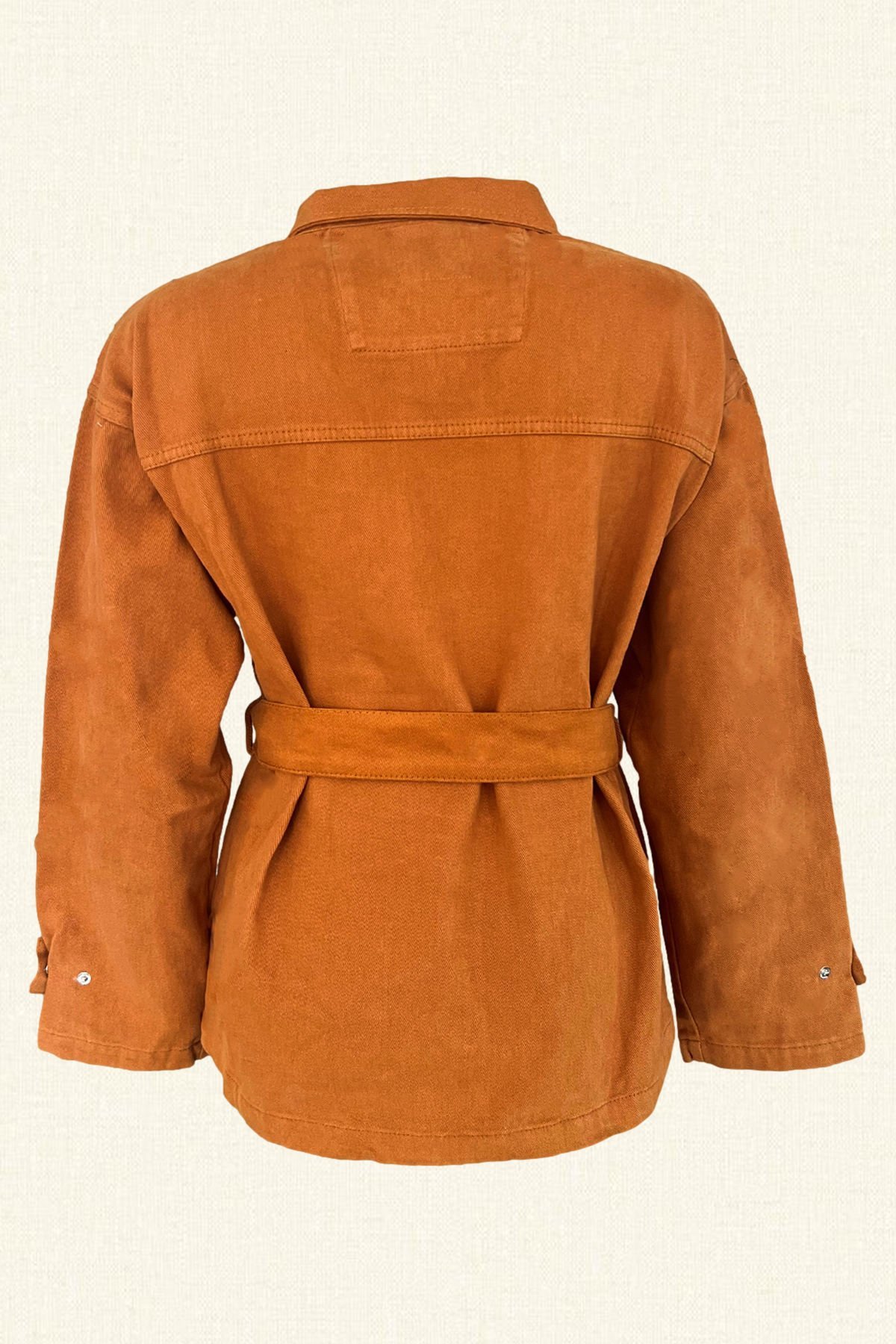 Ön kısmında kahverengi deri üzerine boncuklardan sincap işlemesi bulunan, kiremit renk, kemer detaylı jean ceket.