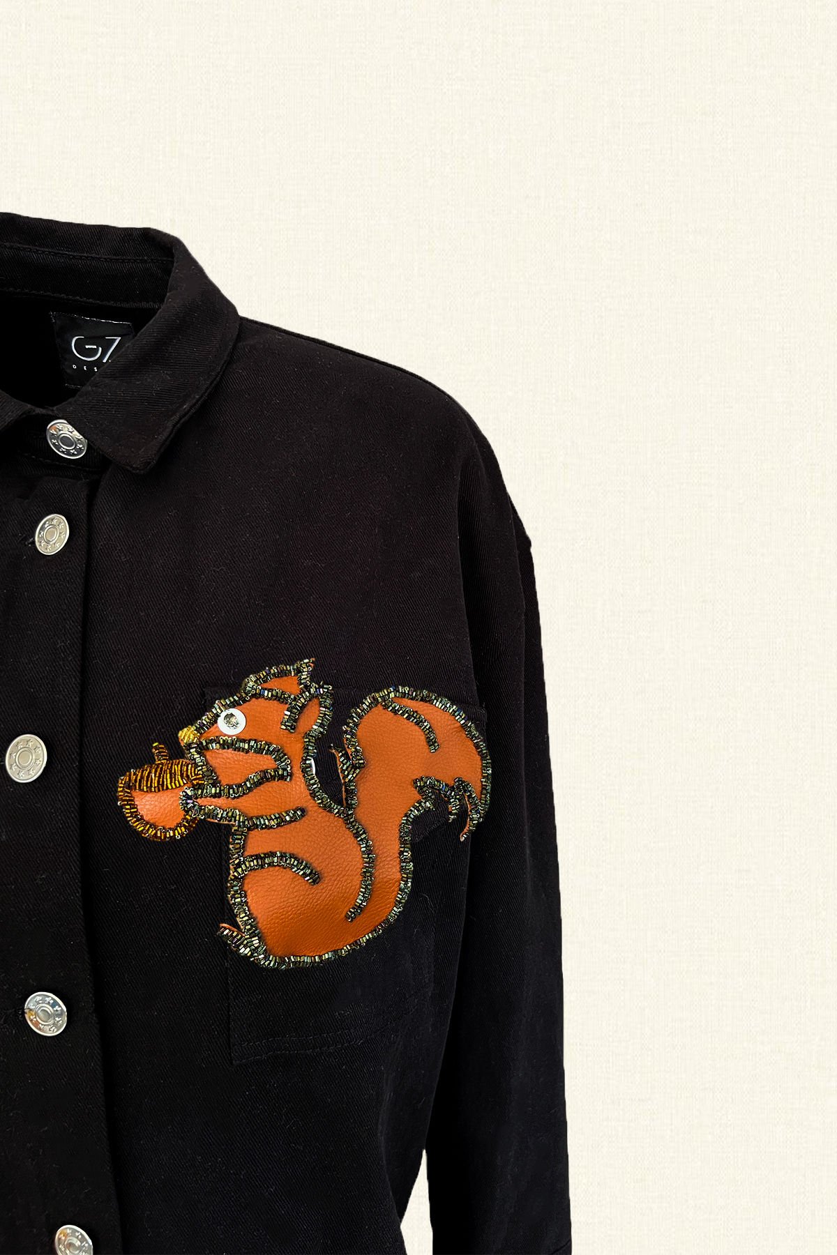 Ön kısmında kahverengi deri üzerine boncuklardan sincap işlemesi bulunan, arka kısmında düğme detayı bulunan siyah jean ceket.