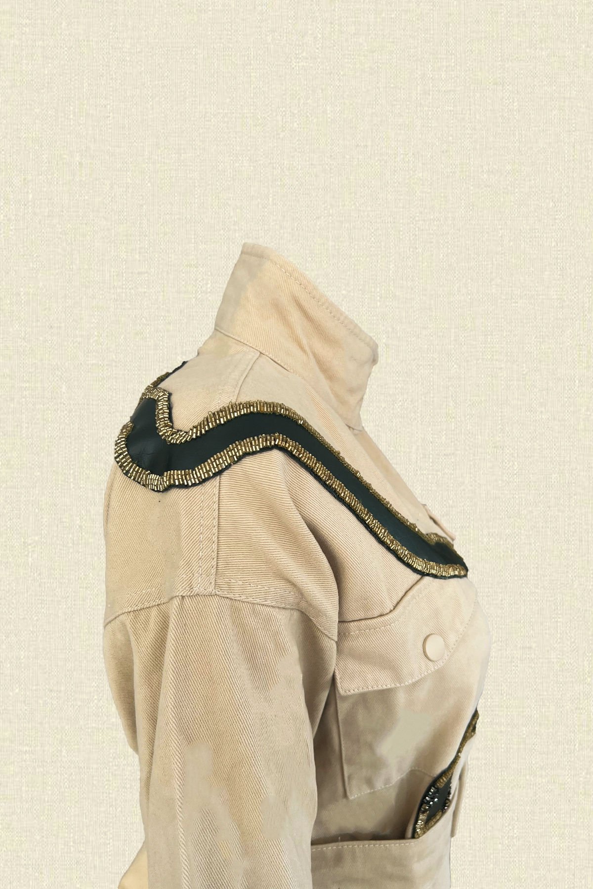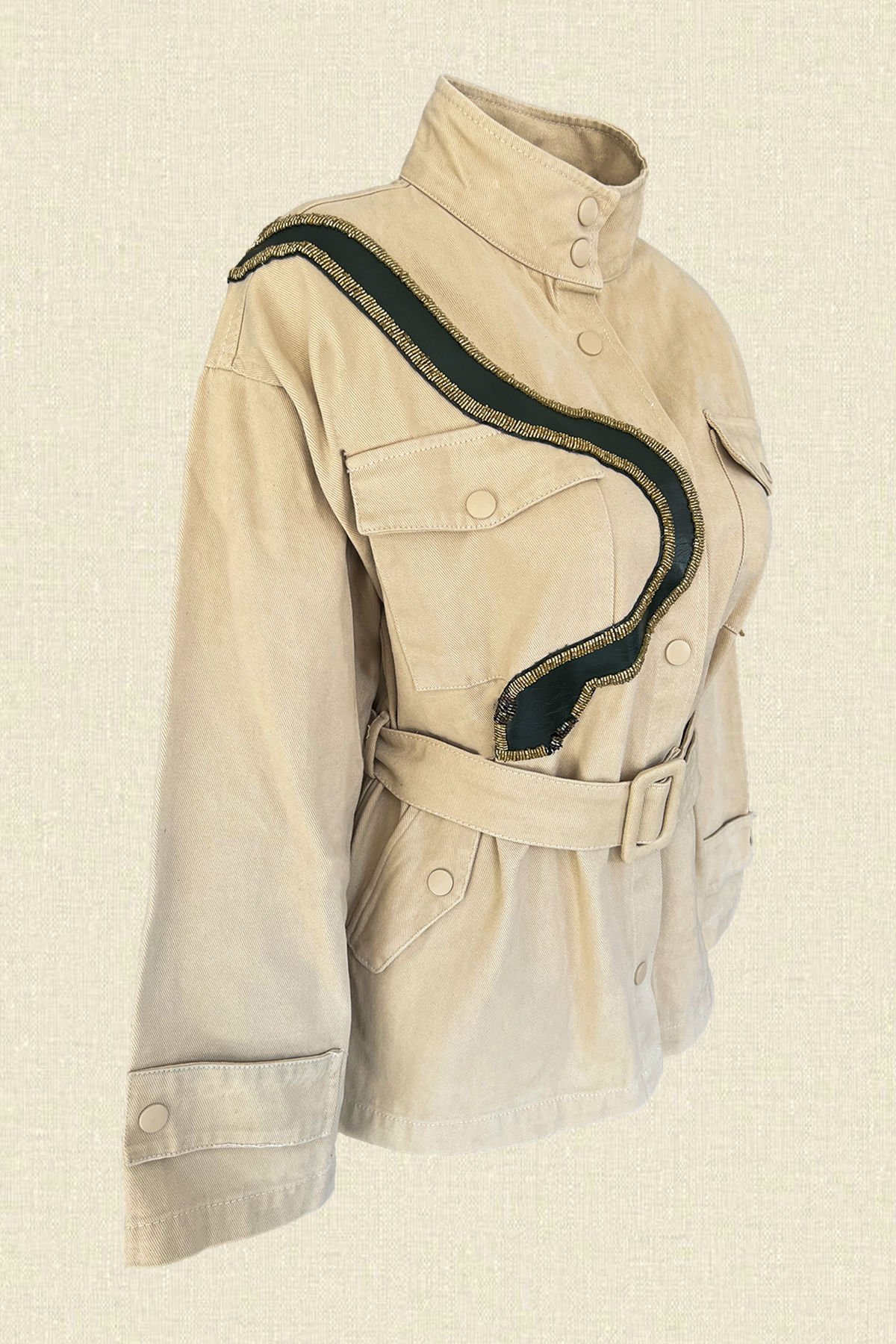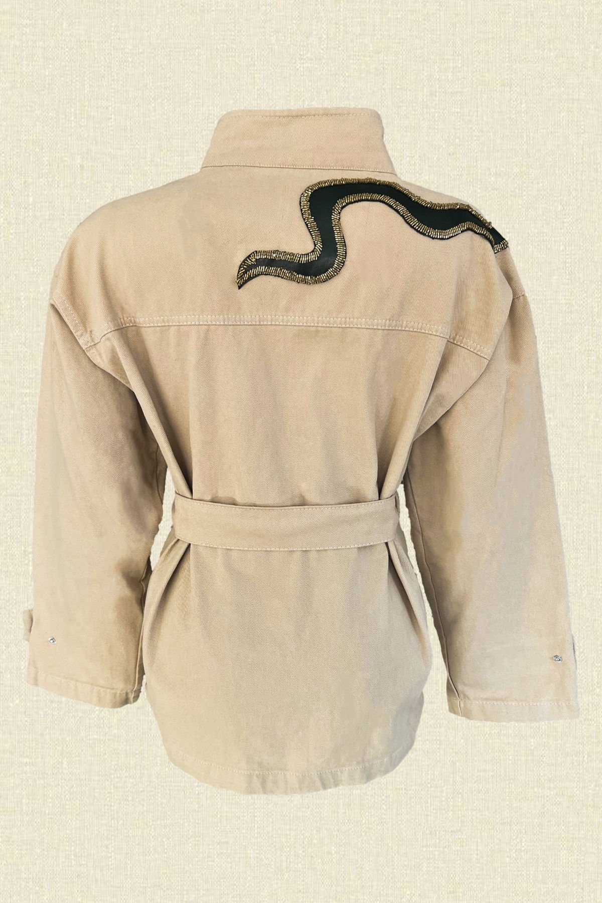 Ön ve arka kısmında deri üzerine boncuklardan yılan işlemeli, beli kemer detaylı, kiremit renk jean ceket.