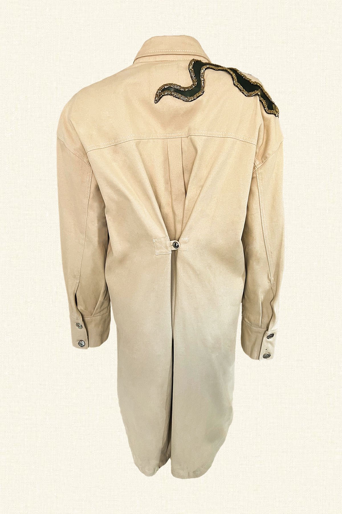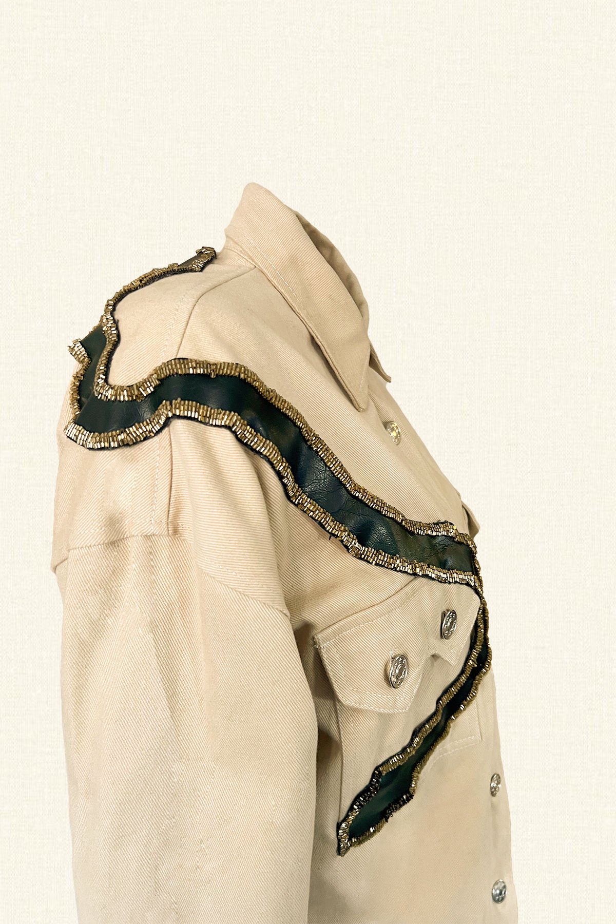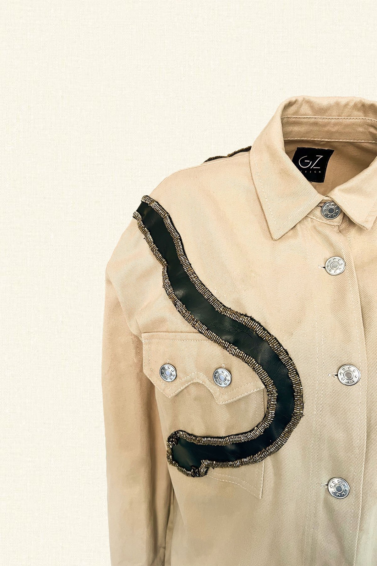 Ön ve arka kısmında deri üzerine boncuklardan yılan işlemeli, arka kısmında düğme detayı bulunan krem jean ceket.