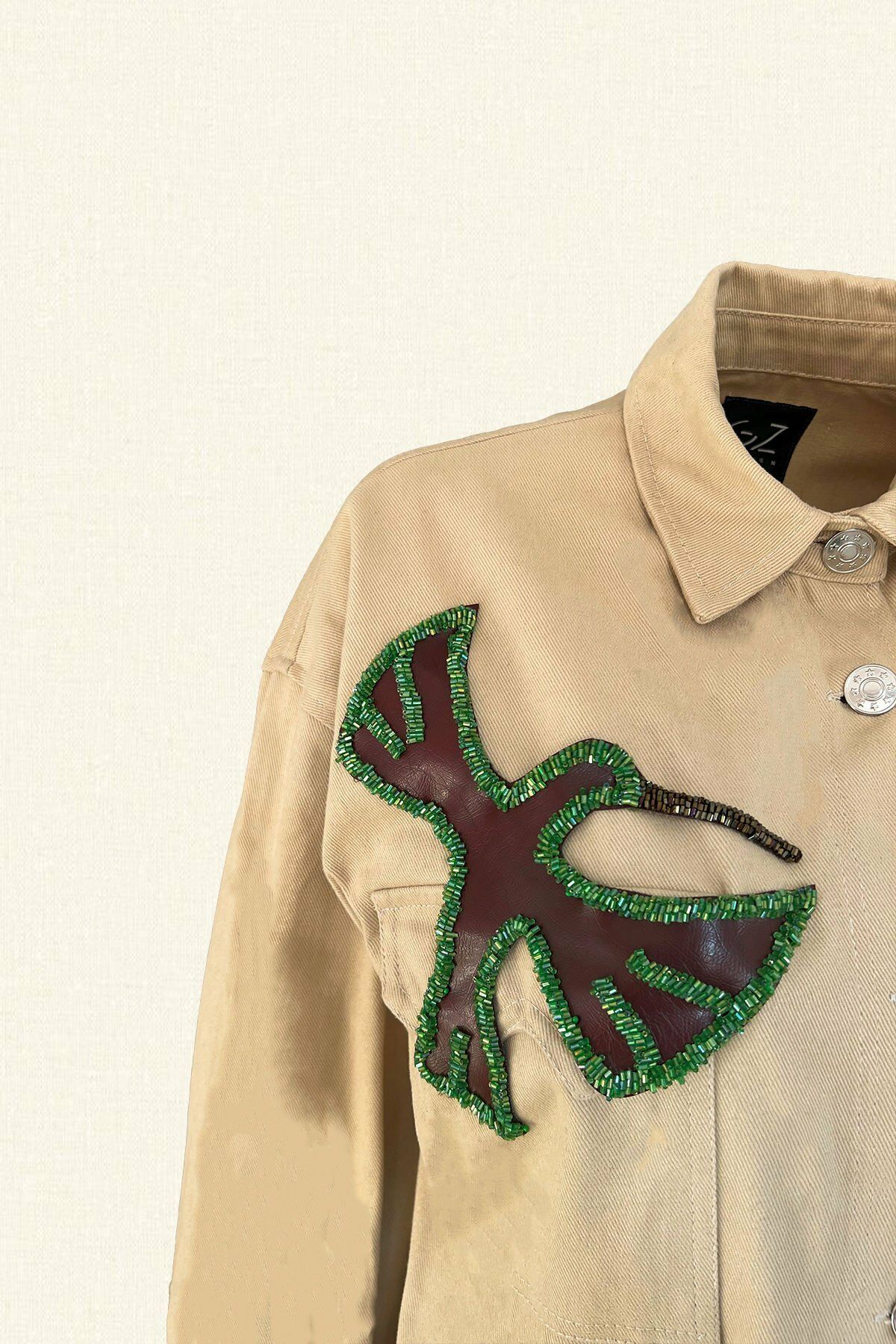 Ön kısmında kahverengi deri üzerine yeşil boncuklardan zümrüdüanka işlemesi bulunan, arka kısmında düğme detayı bulunan uzun krem jean ceket.