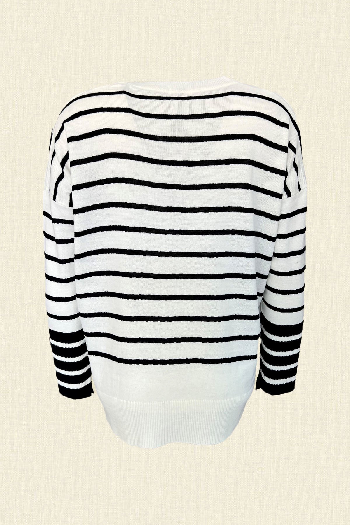 Yaka kısmında bordo deri üzerine kenarları boncuk işlemeli çapa bulunan, yan kısmında yırtmaç detaylı, siyah çizgili beyaz triko kazak.