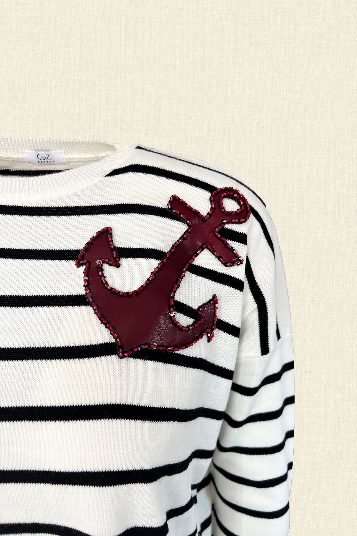 Deri Üzeri Çapa Figürlü Siyah Çizgili Beyaz Triko Kazak