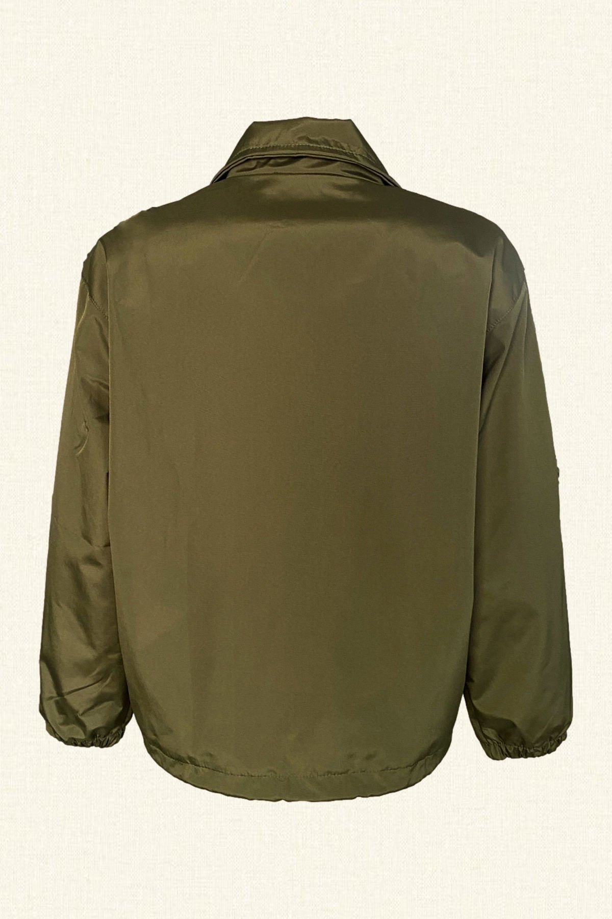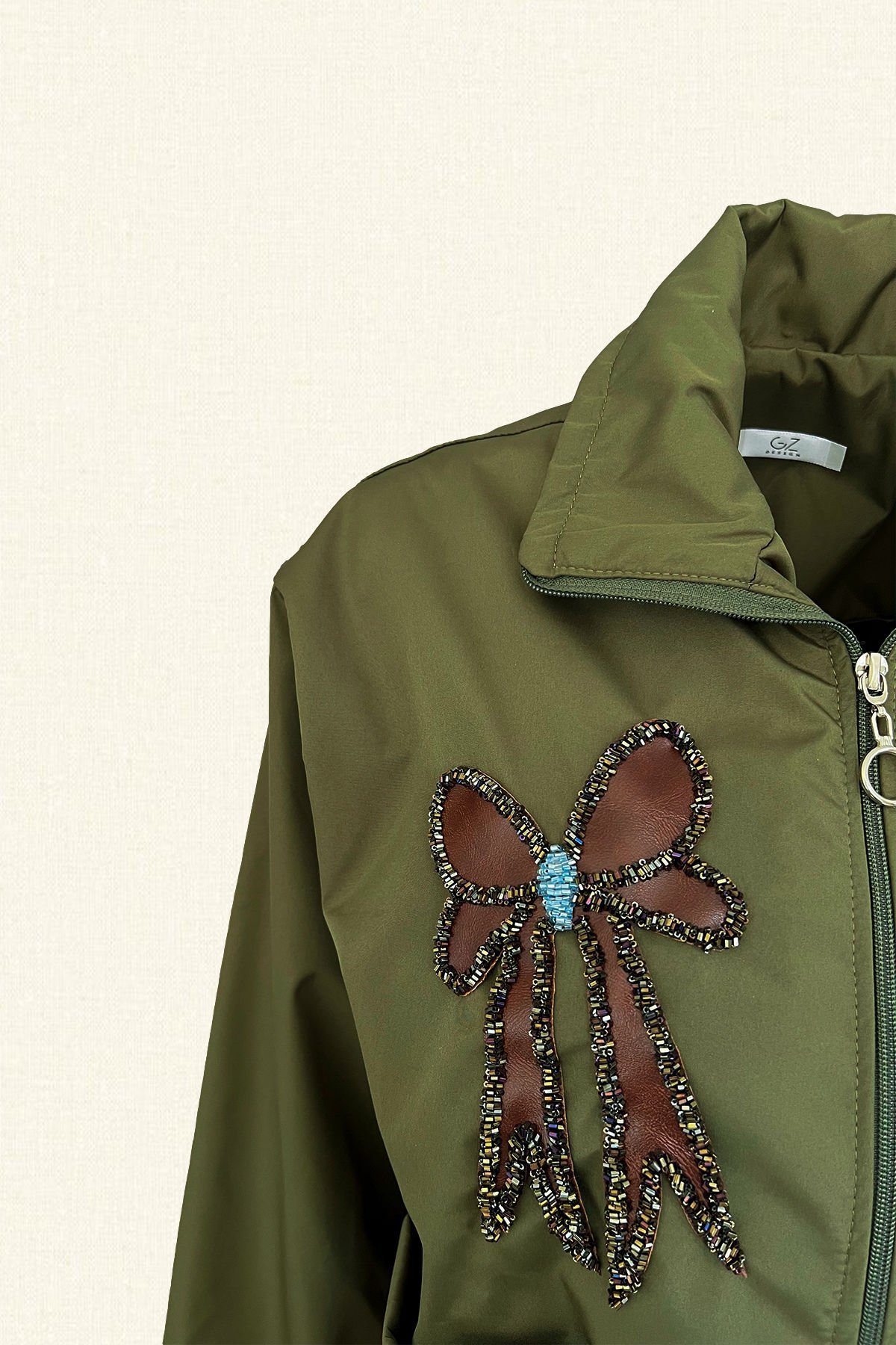 Yaka kısmında deri üzerine boncuklardan fiyonk işlemesi bulunan, kolları lastik ve yağmurluk ucunda bağlama detayı bulunan haki yeşili astarlı yağmurluk.