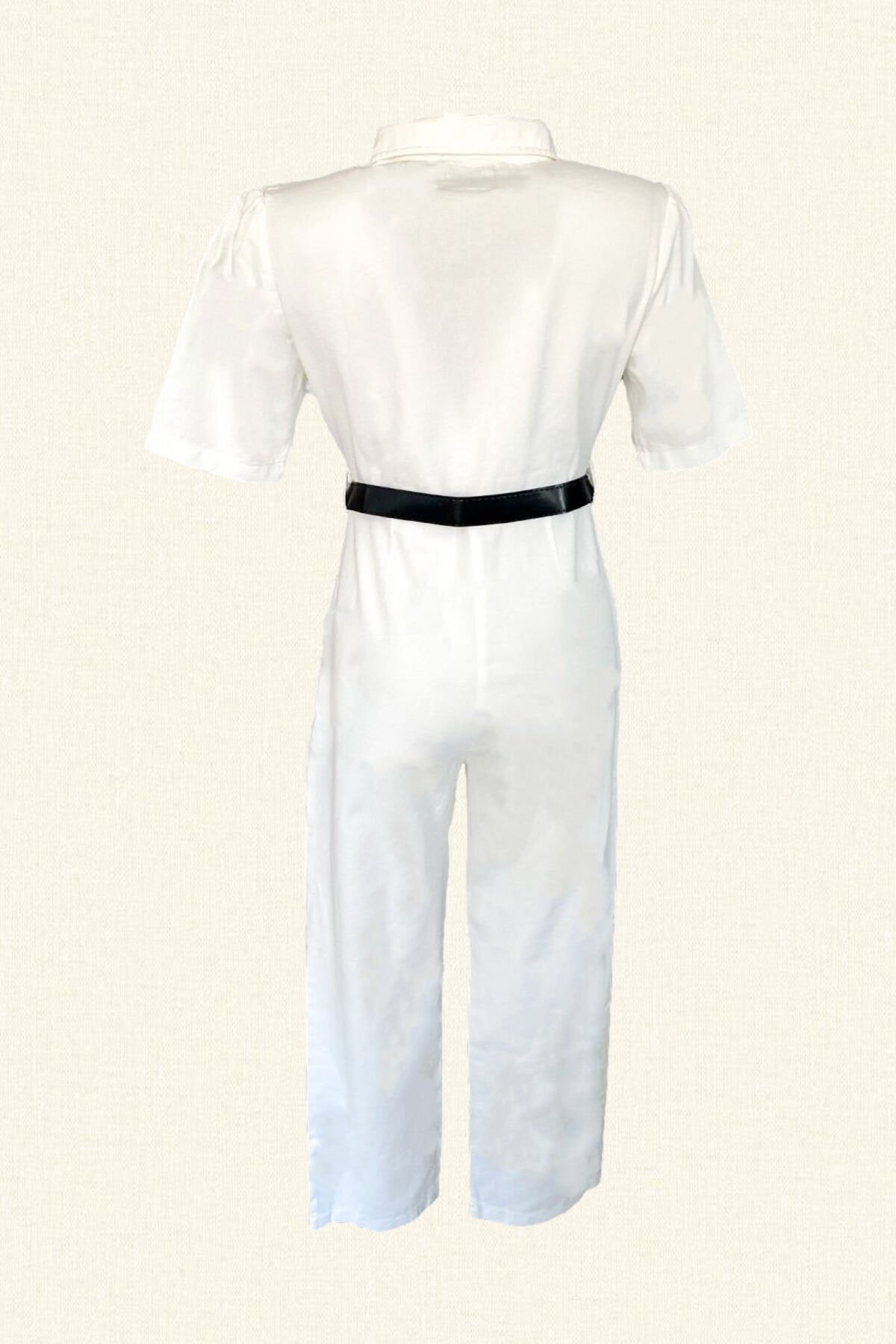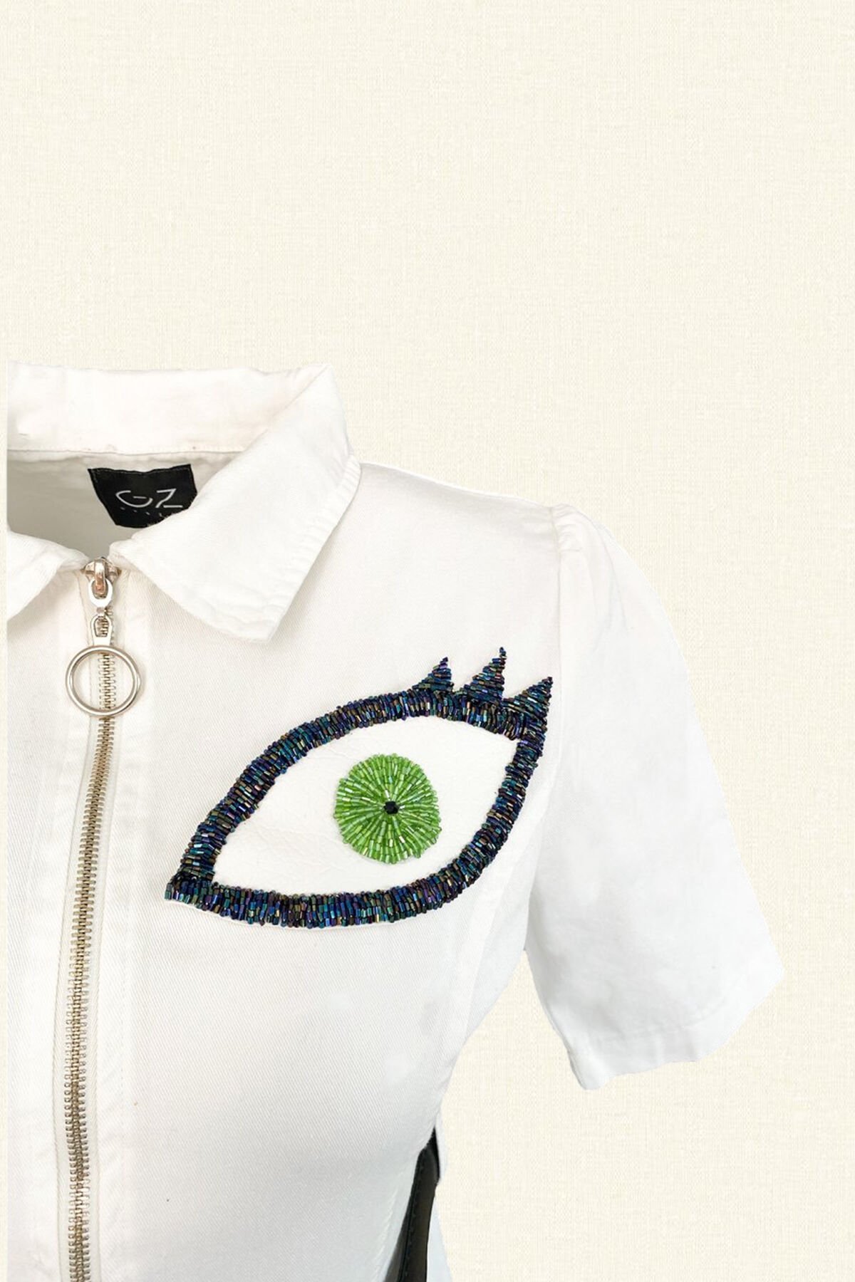 Ön kısmında deri üzerine yeşil göz işlemesi bulunan, siyah deri kemerli, önü fermuarlı beyaz renk slim fit jean tulum.