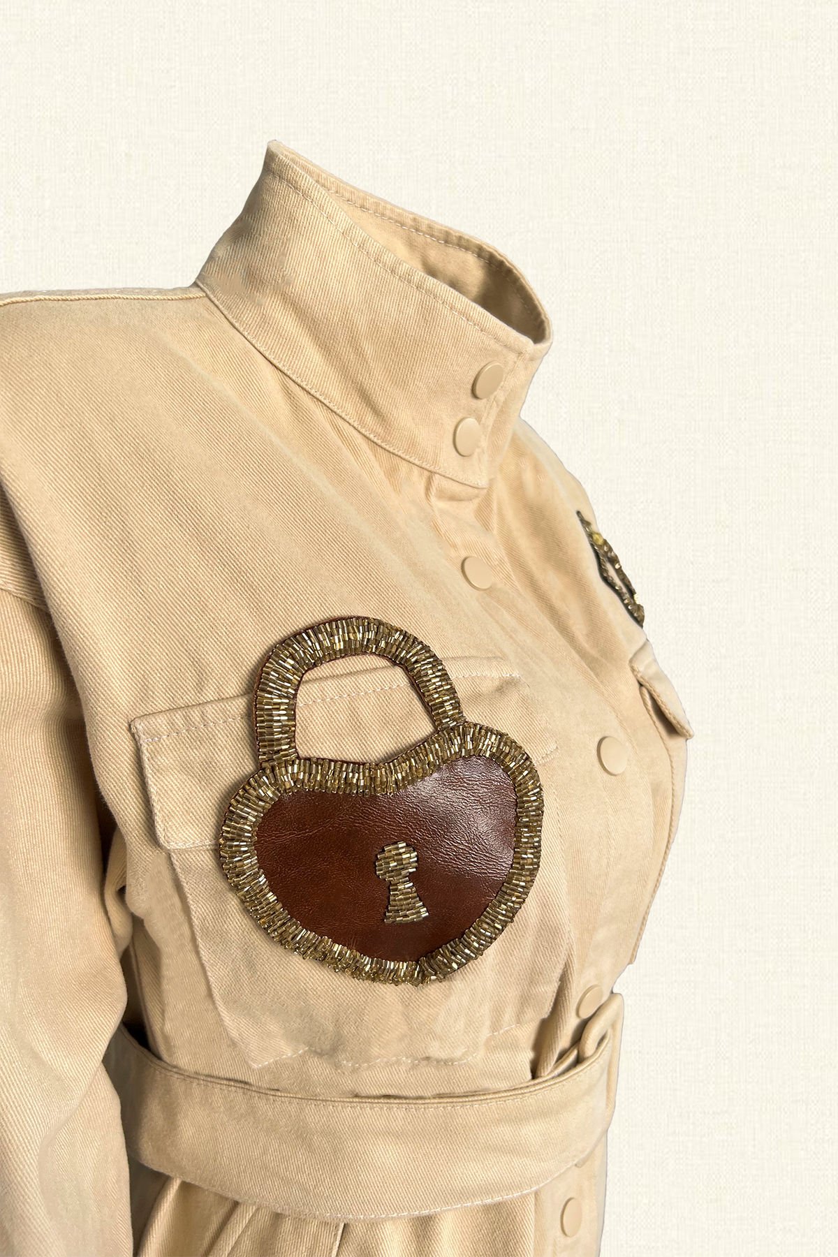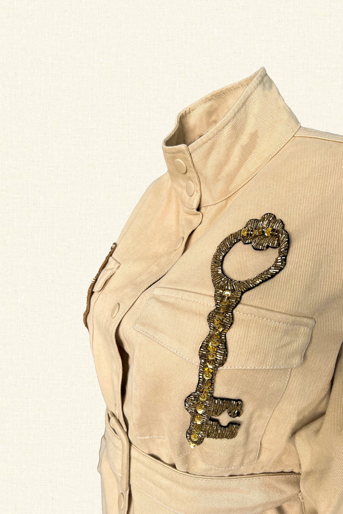 Sağ cep kısmında kalp şeklinde deri üzerine boncuklardan kilit figürü bulunan, sol cep kısmında gold anahtar işlemeli krem renk, kemer detaylı jean ceket.