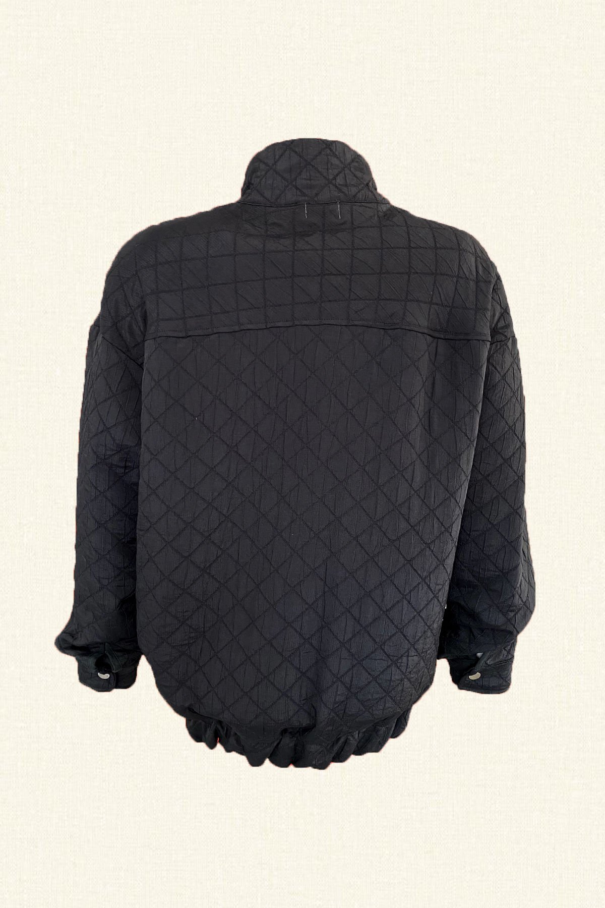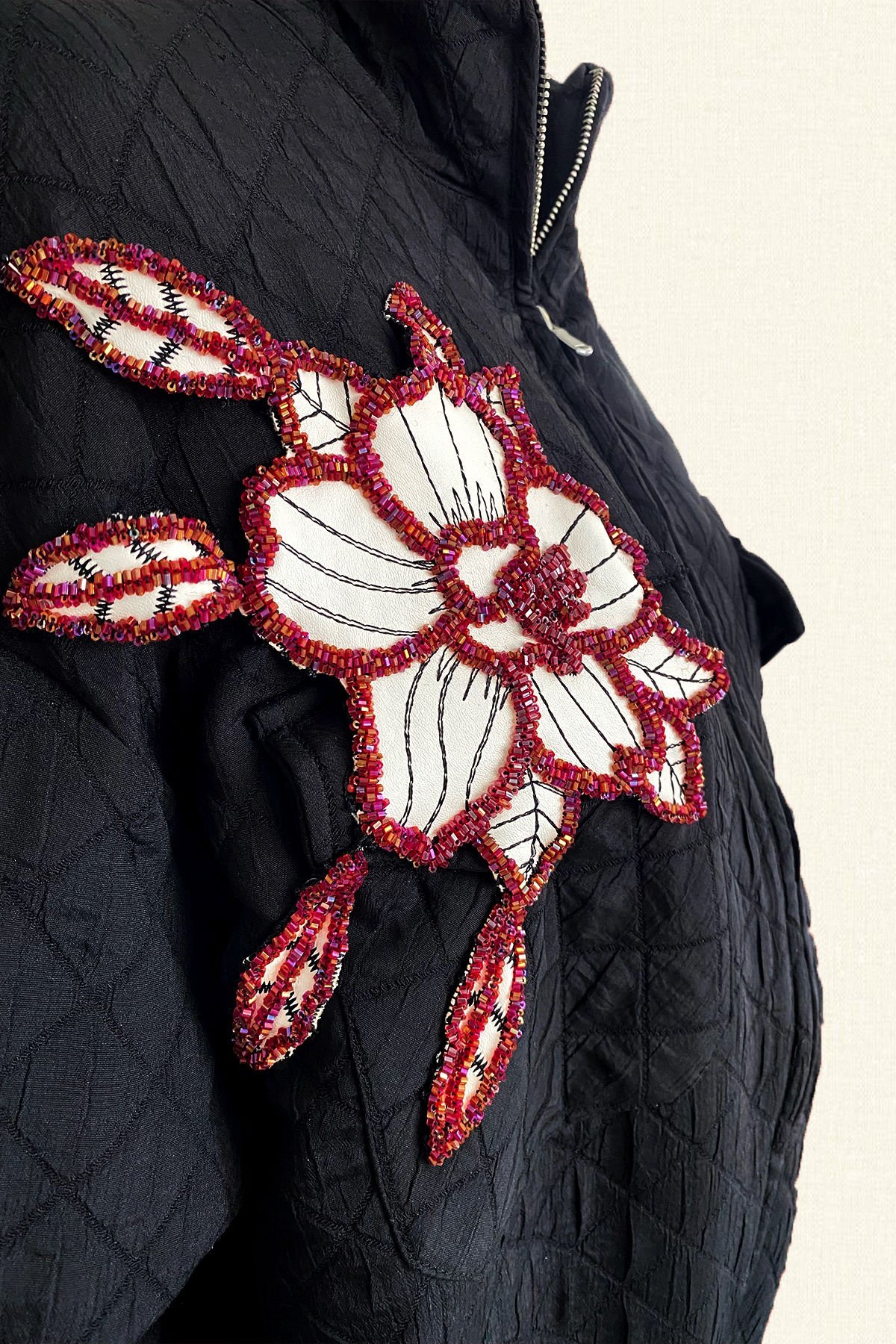 Beyaz deri üzerine kırmızı boncuk işlemeli, çiçek motifli siyah bomber ceket.