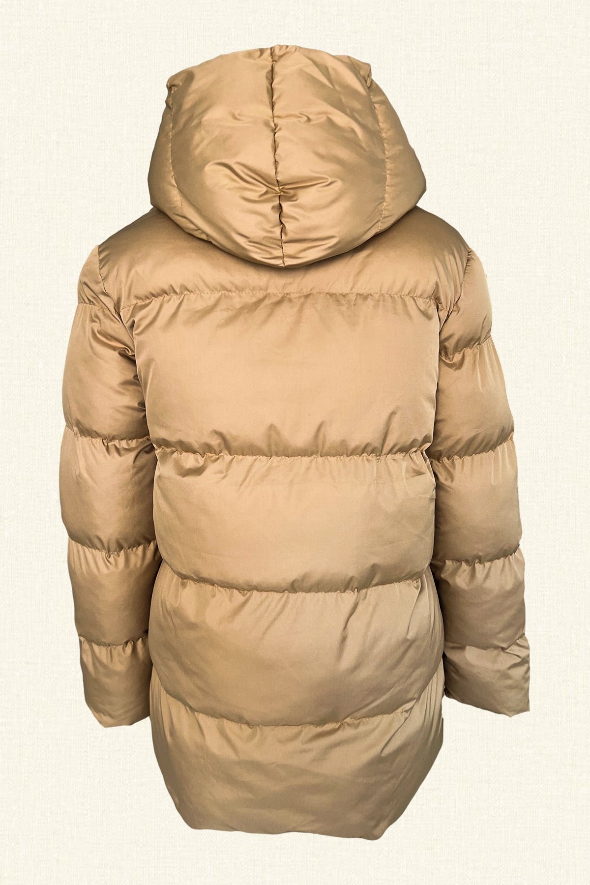 Ön kısmında deri üzerine boncuklardan kuş işlemesi bulunan, çıt çıt kapamalı, krem şişme mont.