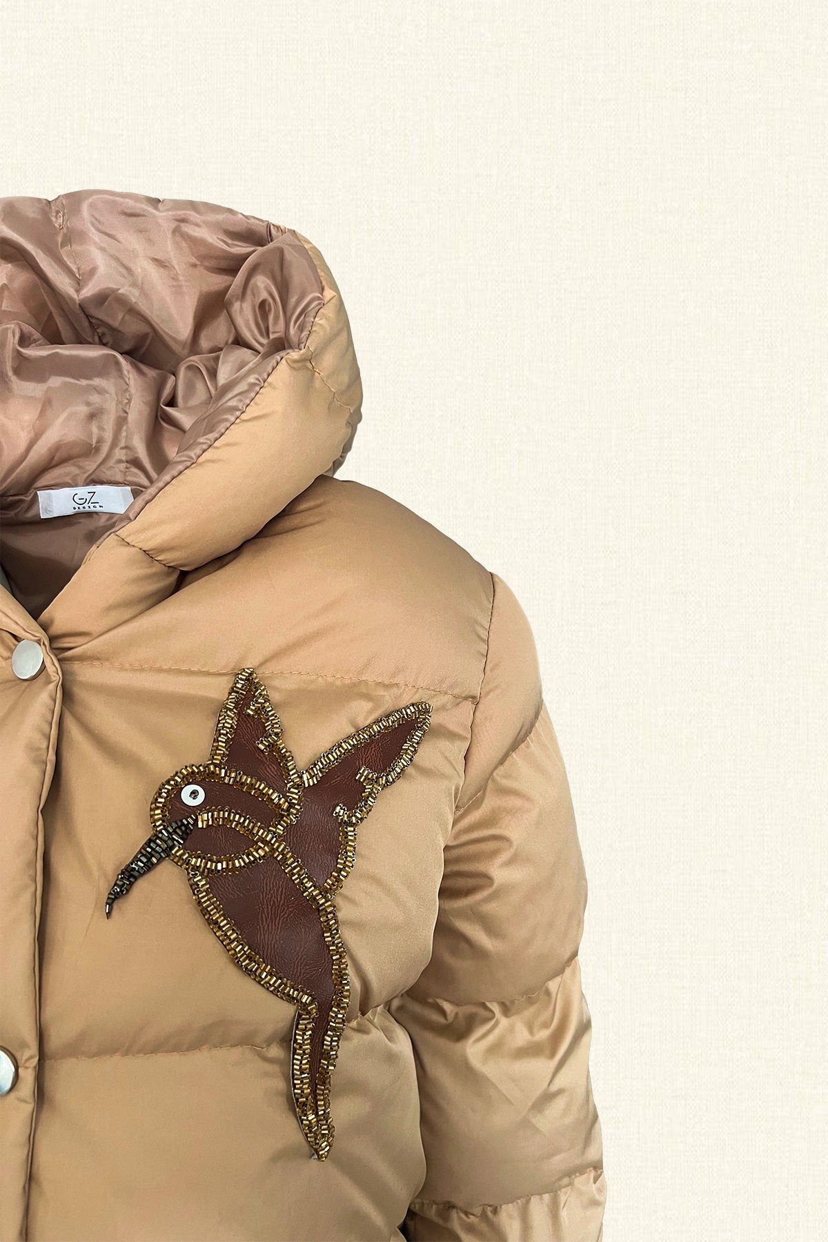Deri Üzeri Kuş Figürlü Krem Şişme Mont