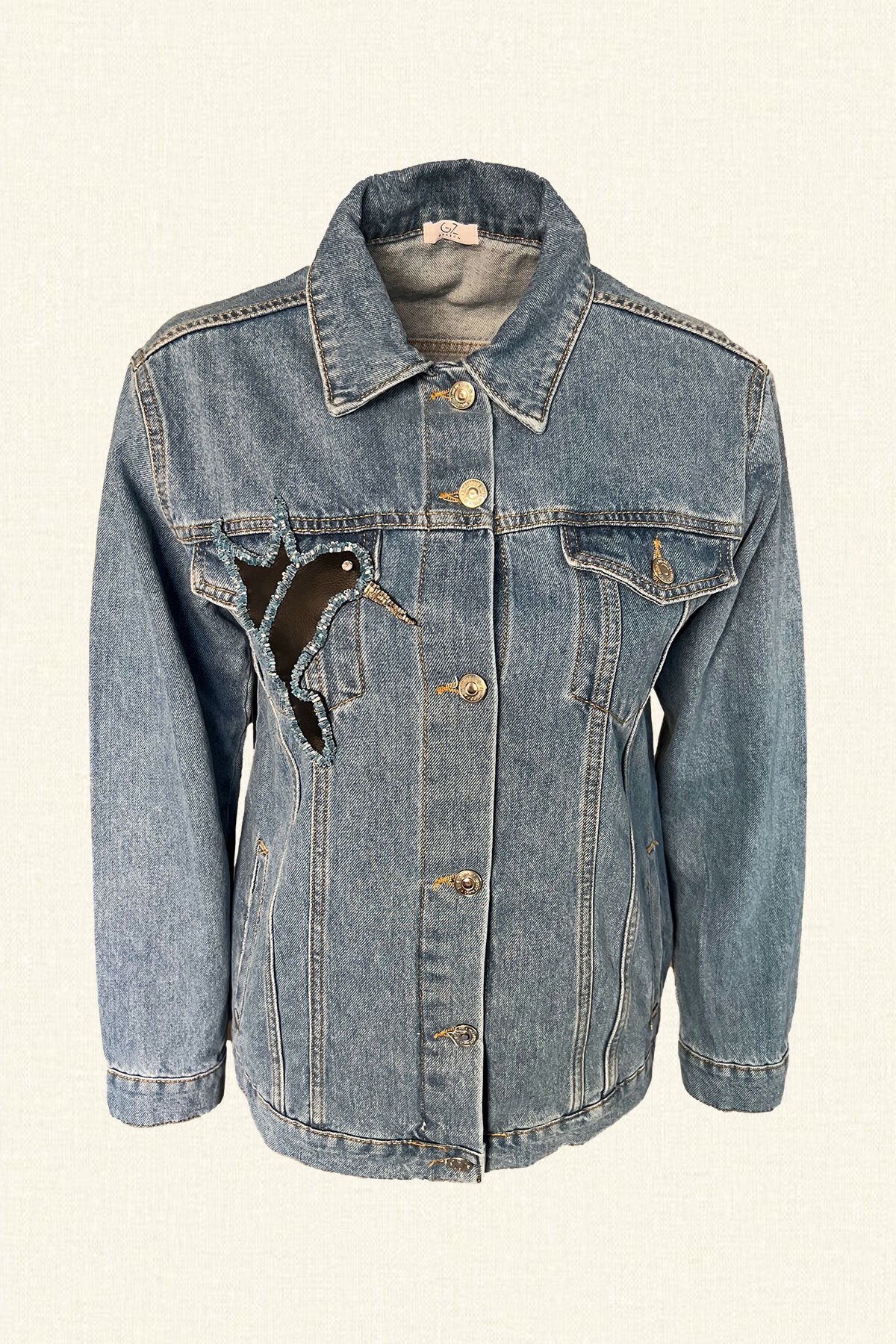 Göğüs kısmında deri üzerine boncuklardan kuş işlemesi bulunan, yakası çıkarılabilir siyah kürk detaylı jean ceket.