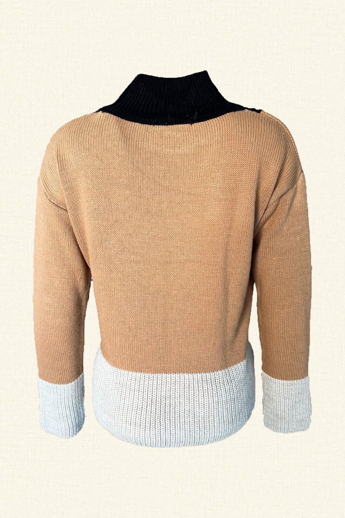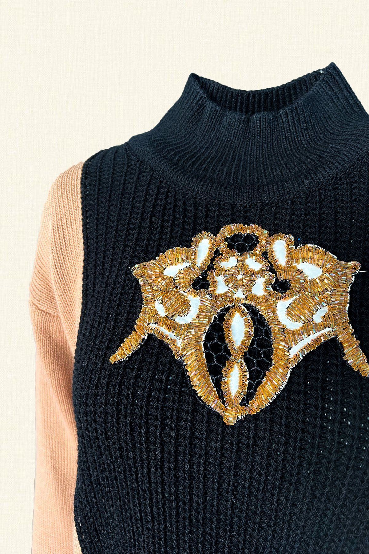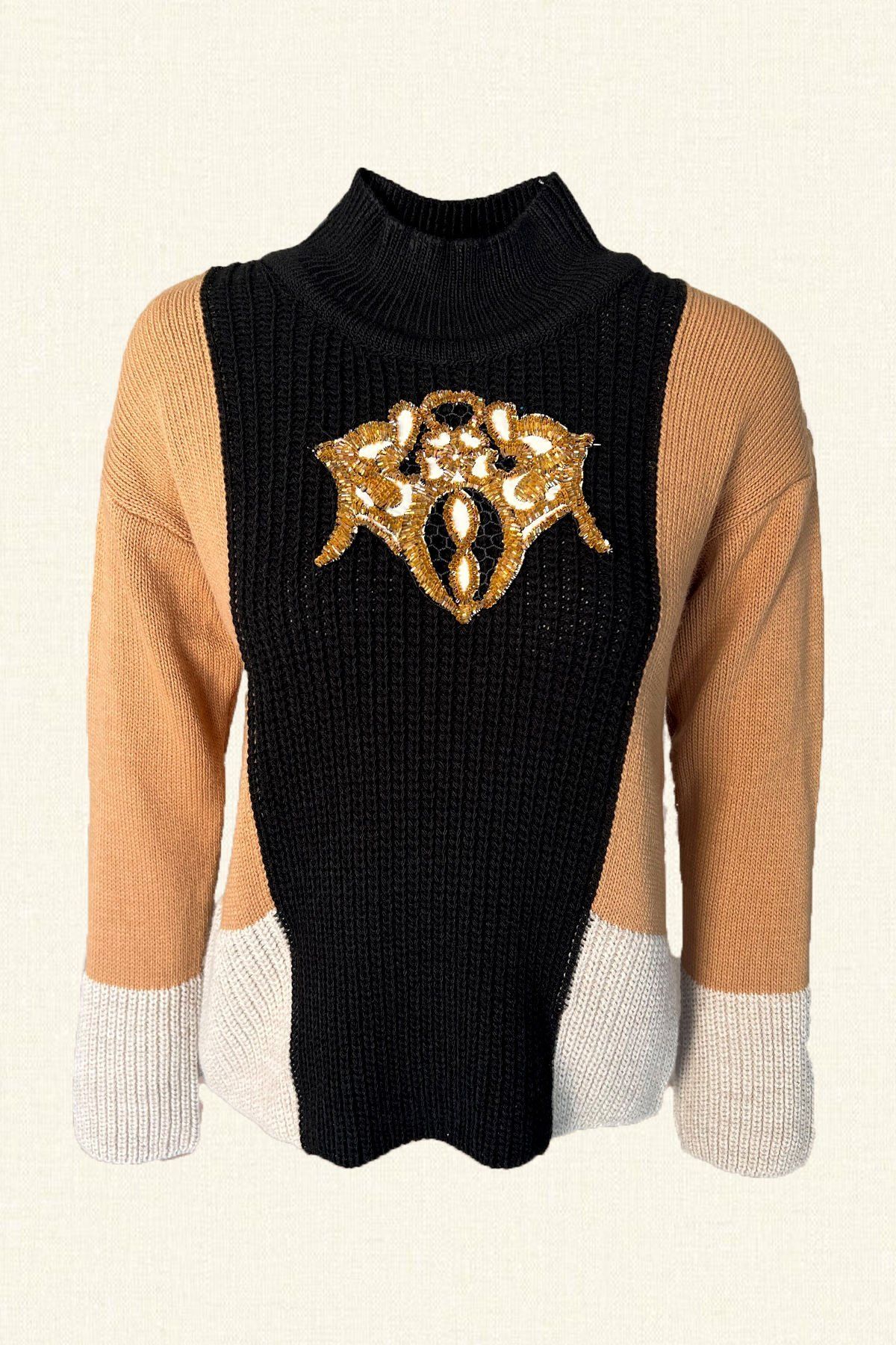 Deri Üzeri Turuncu İşlemeli 3 Renkli Triko Kazak