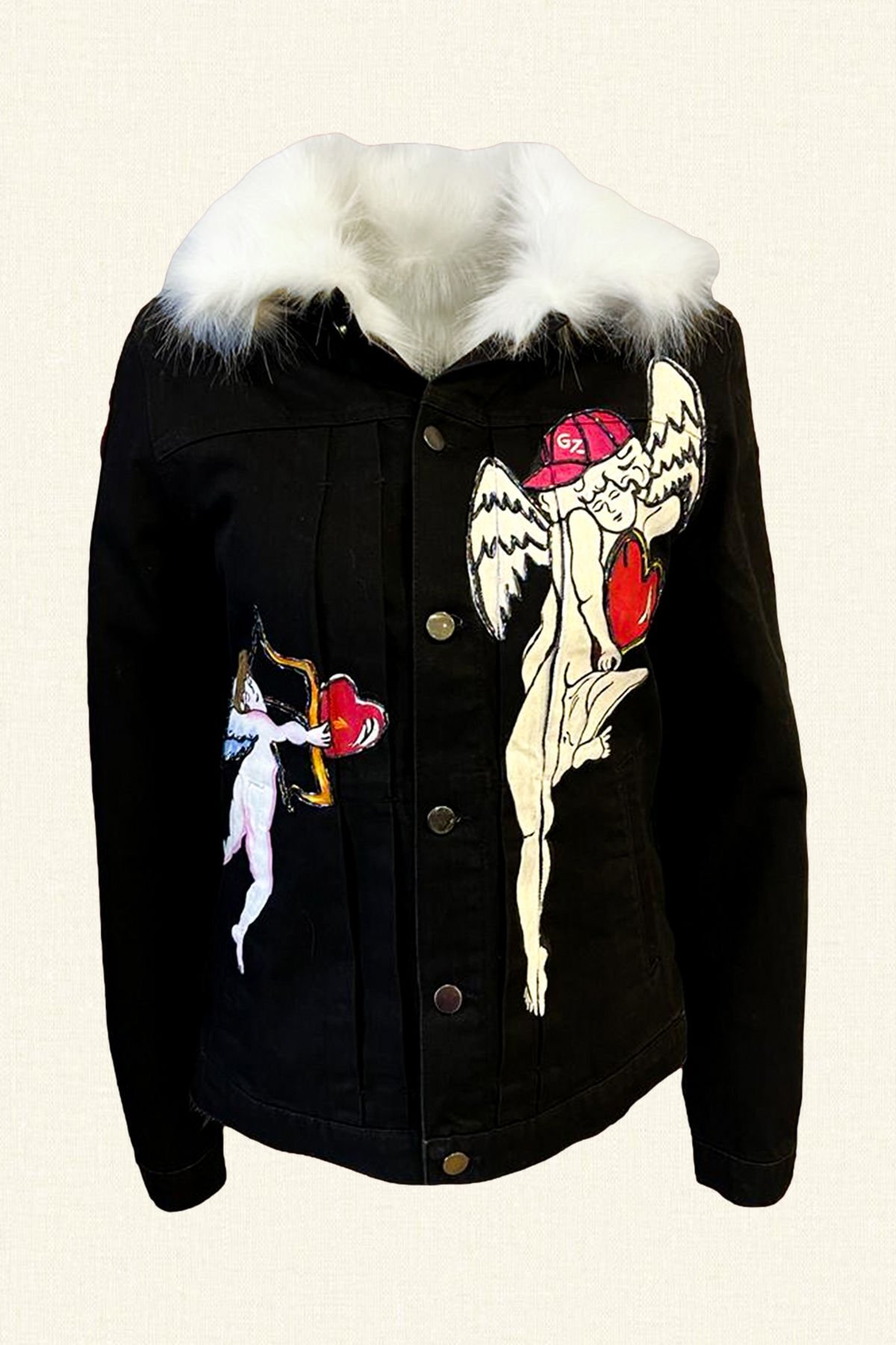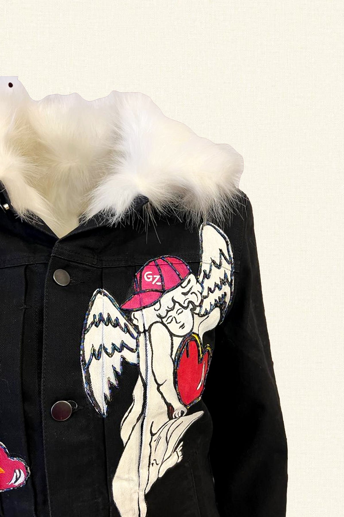 El Boyaması Melek Figürlü İçi Kürklü Siyah Jean Ceket