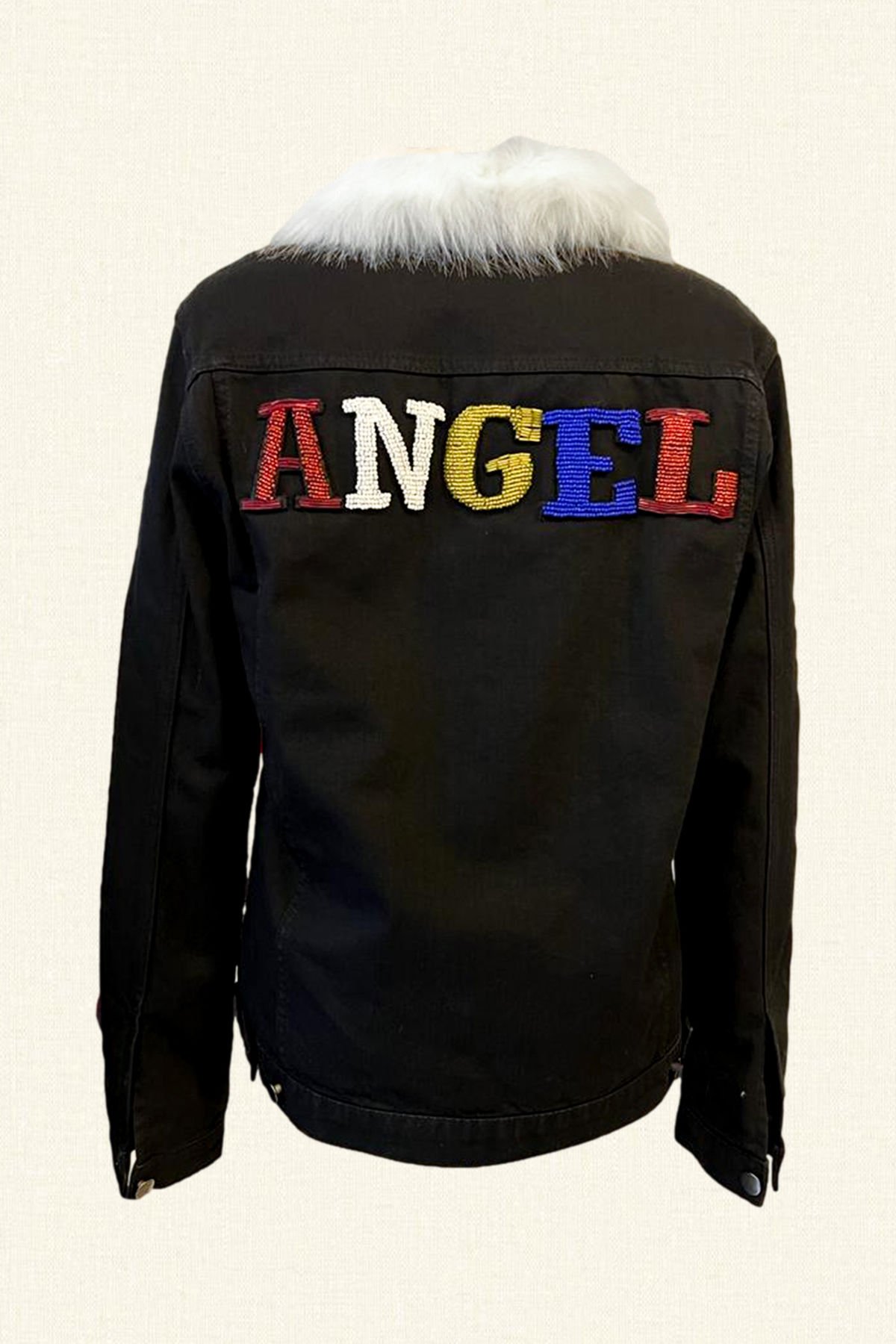 Önü el boyaması melek figürü üzeri boncuk işlemeli yakası ve içi beyaz kürk detaylı kolları kapitone kumaşlı, sırtı boncuk işlemeli angel yazılı siyah jean ceket.