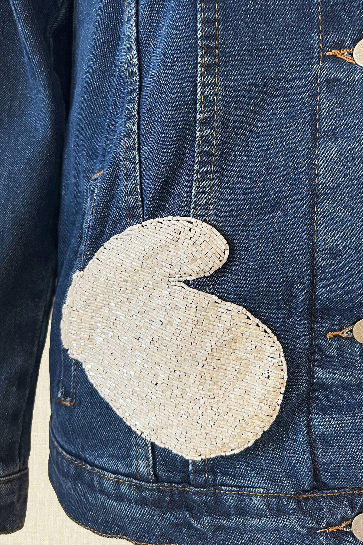 Yakası ve kolları beyaz kürk detaylı ceplerinde beyaz kristal boncuk işlemeli eldiven motifli koyu renk jean ceket.