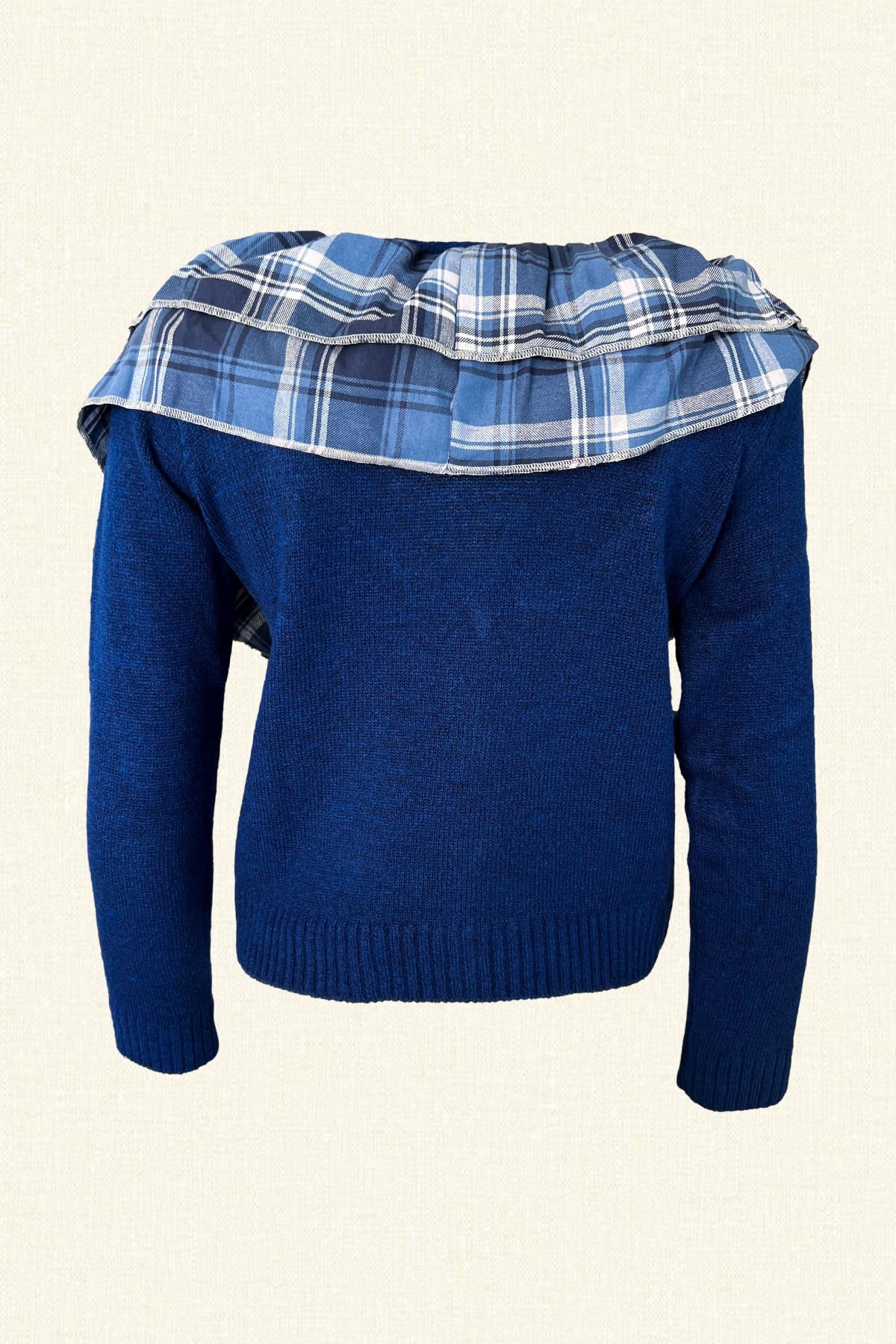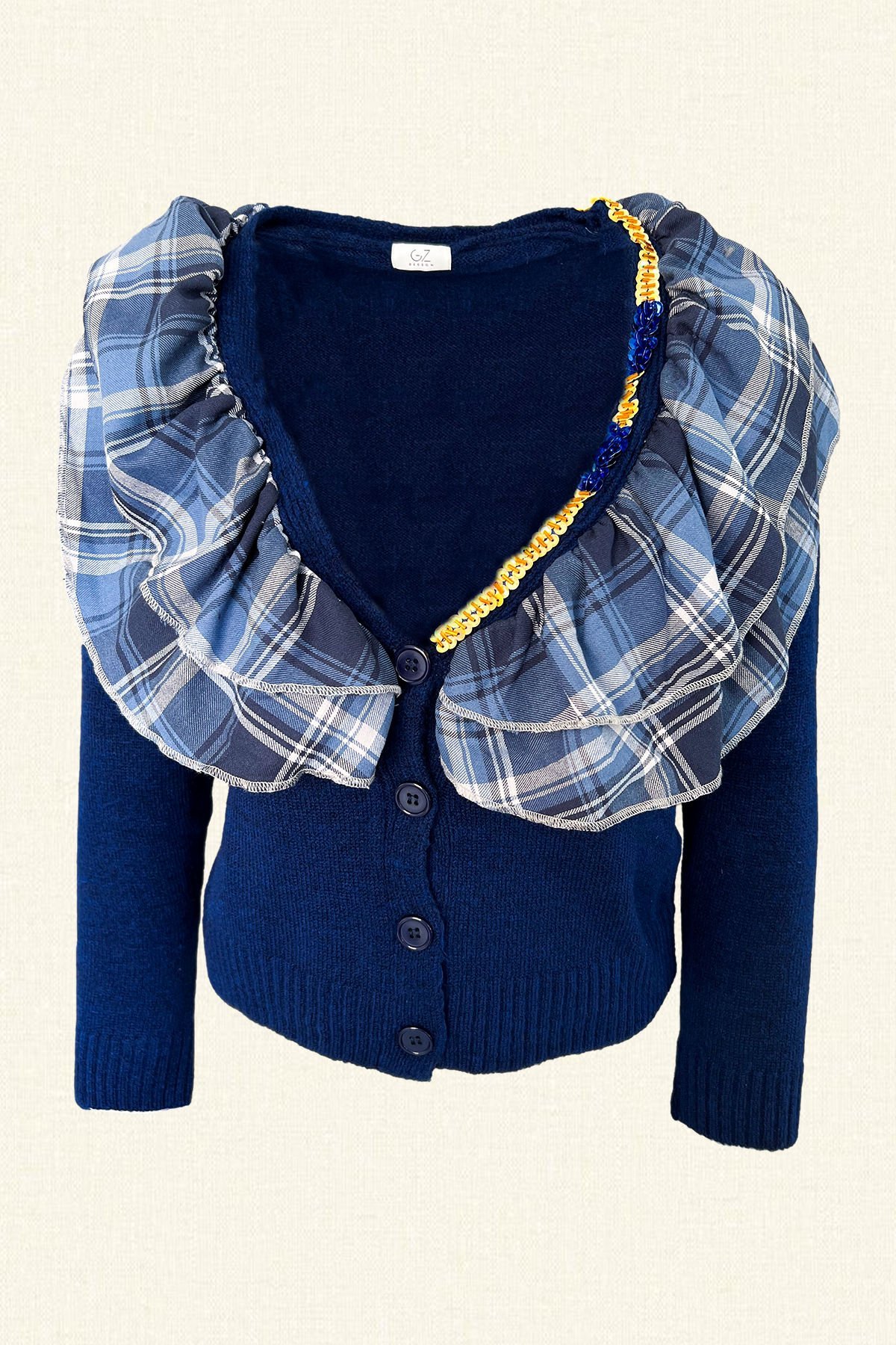 Yaka kısmında renkli pul ve boncuklardan şerit şeklinde işlemesi bulunan, yakası fırfırlı, lacivert renk triko hırka.