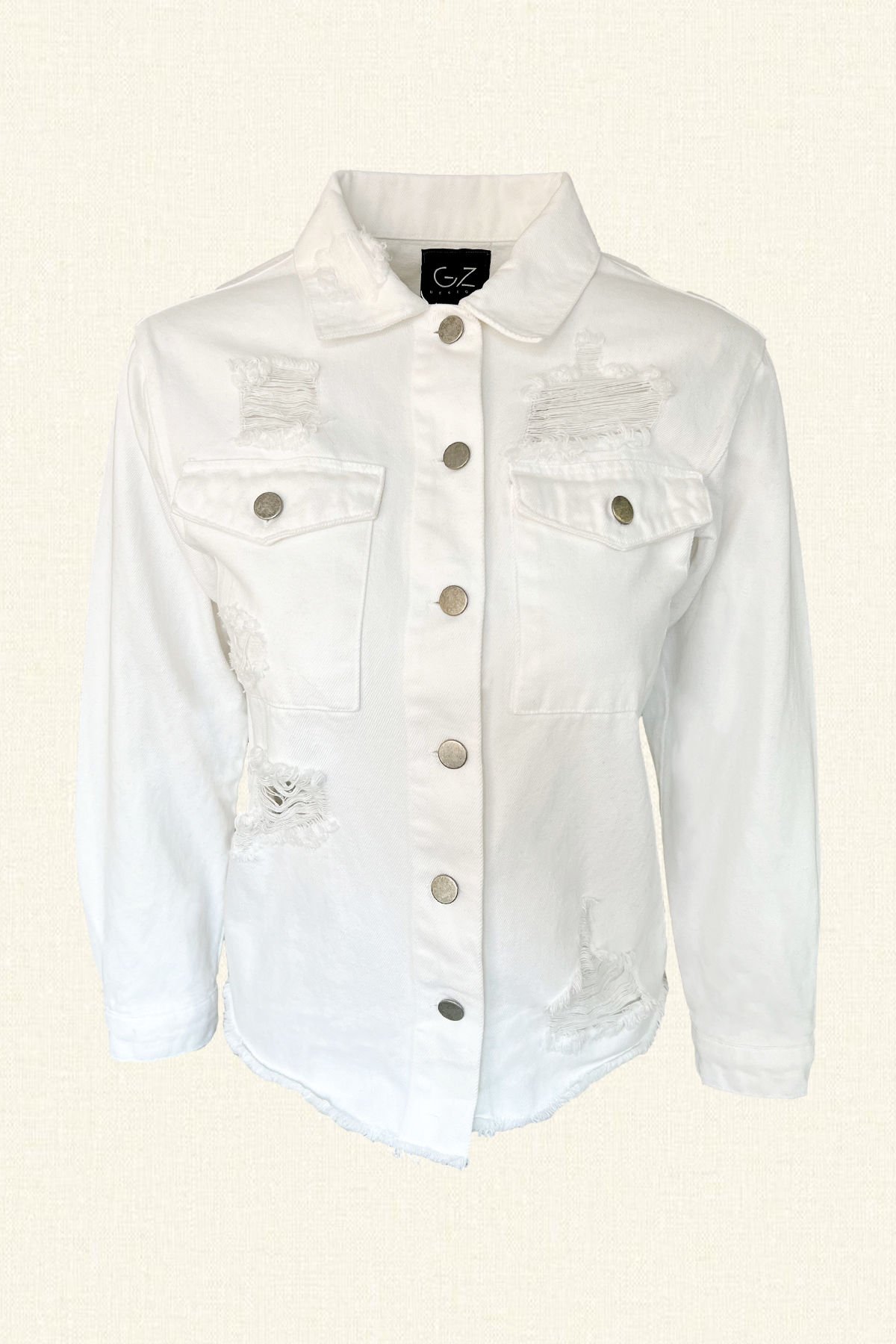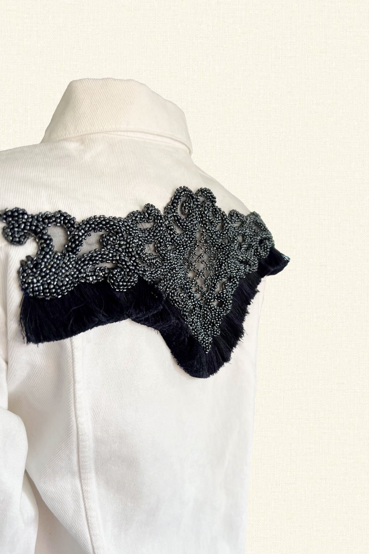 Arka kısmında tül üzerine füme boncuklardan işlemesi bulunan, püsküllü, yırtık ve eskitme detaylı beyaz jean ceket.