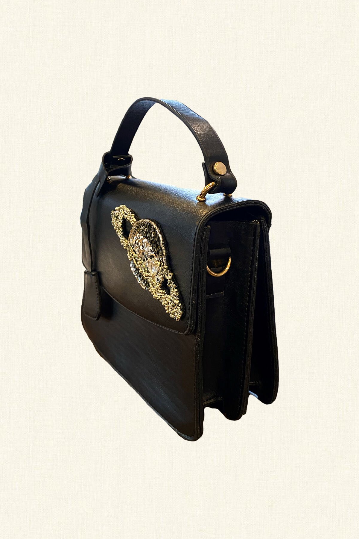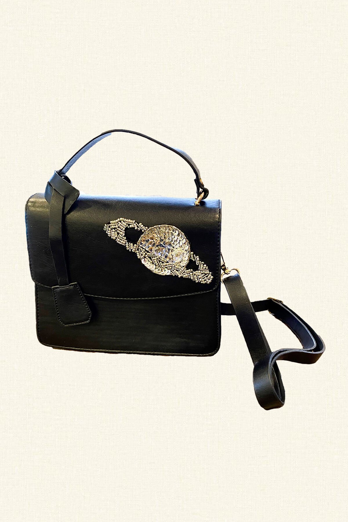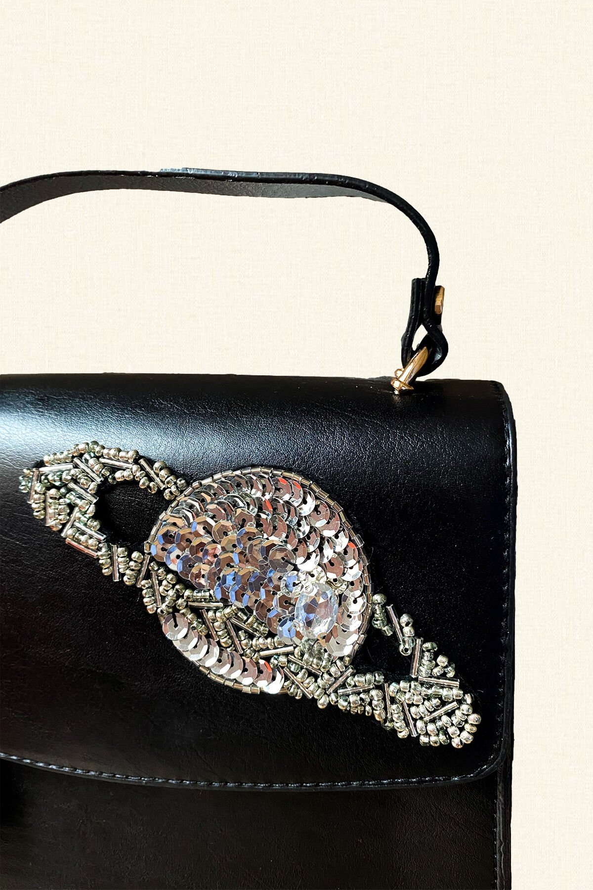 Siyah renk, gezegen işlemeli, suni deri çanta.