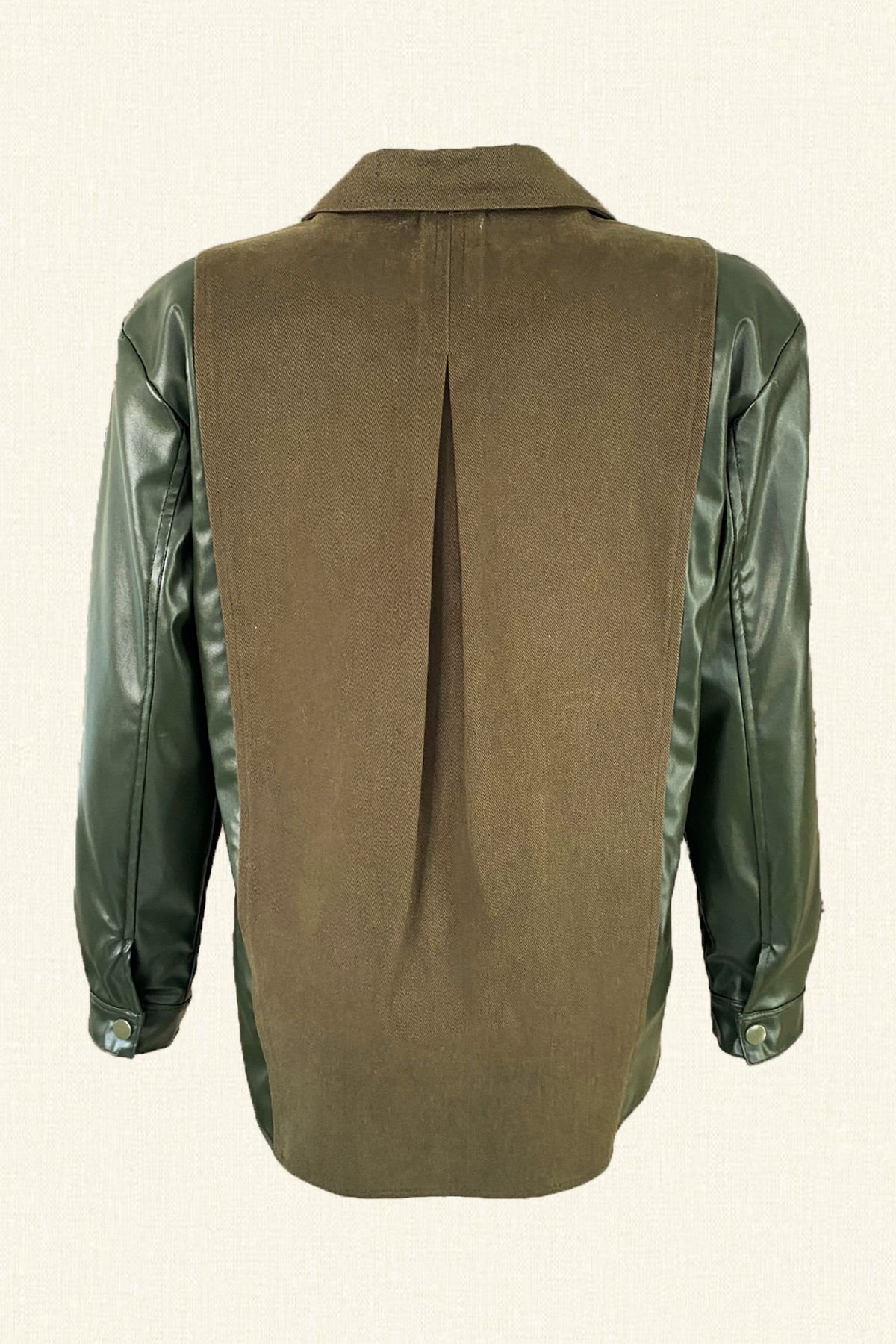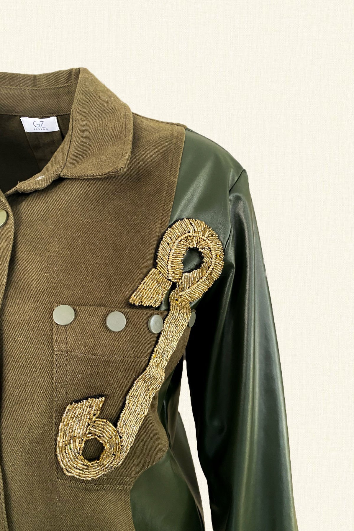 Kolları deri detaylı, yakasında gold boncuklardan çengelli iğne motifi bulunan yeşil jean ceket.