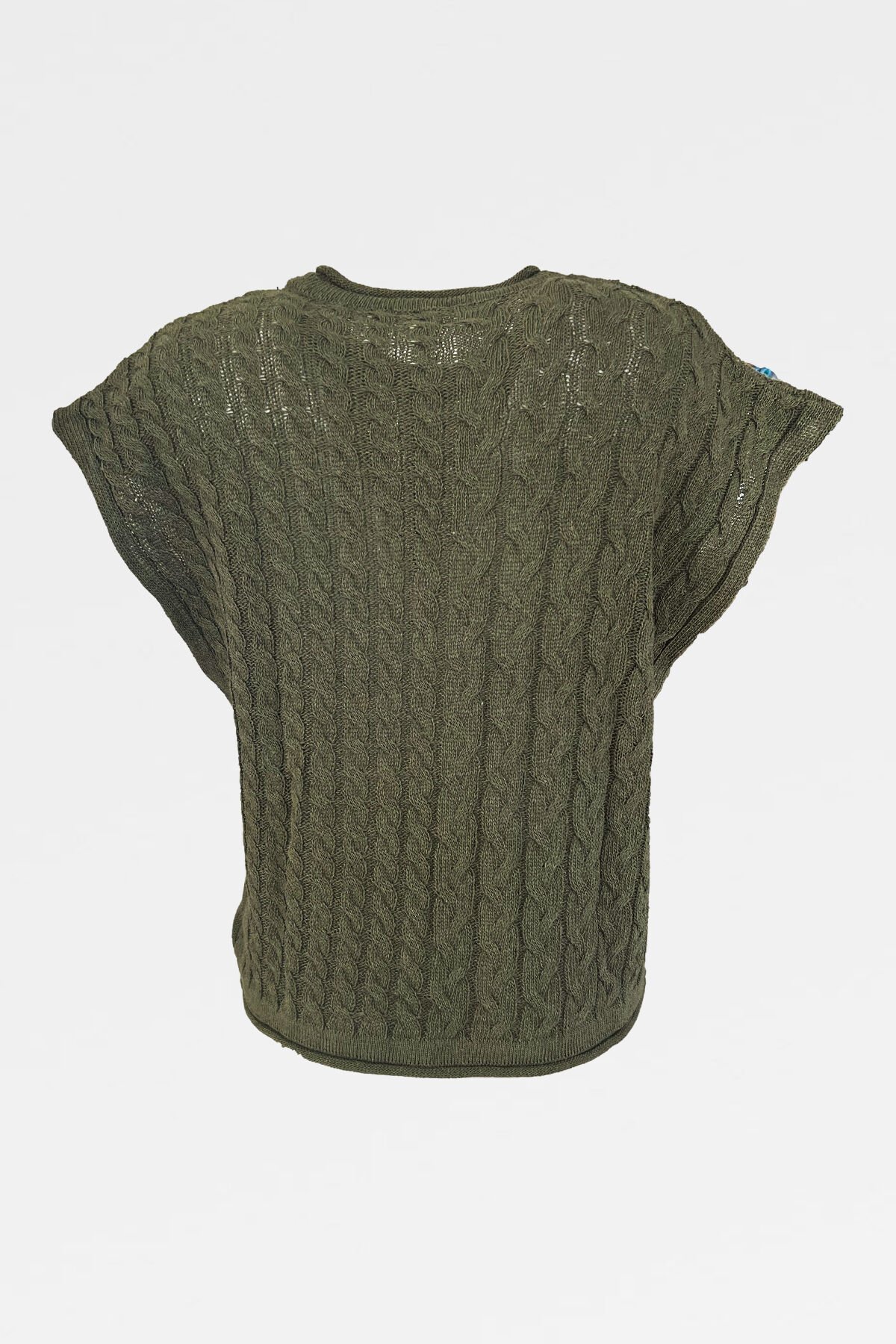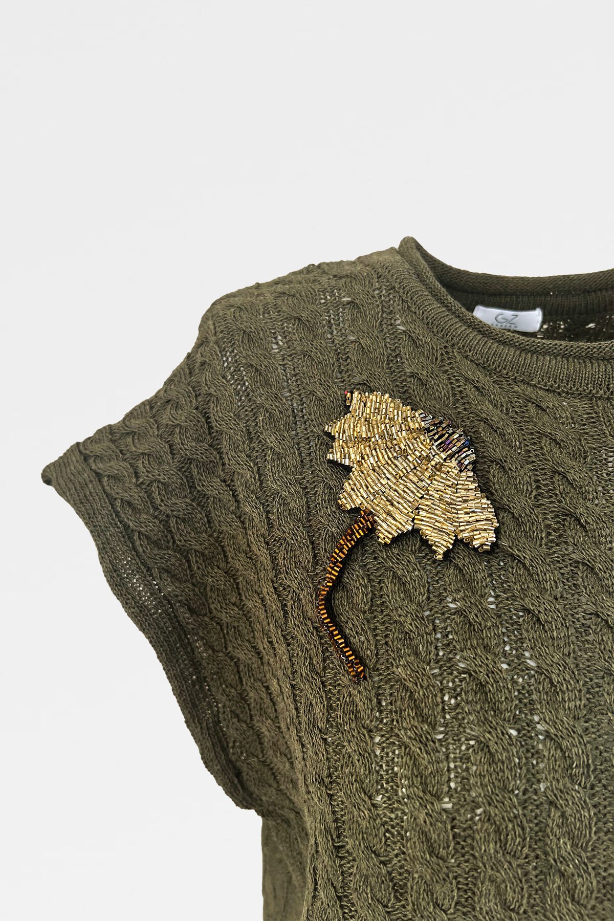 Yakasında boncuklardan çiçek işlemesi bulunan, yeşil örme triko süveter.