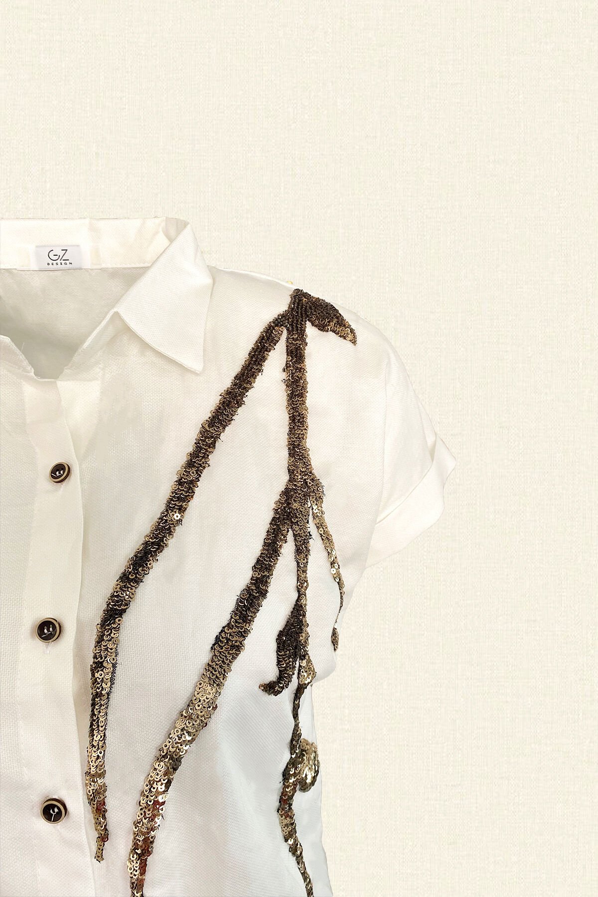 Gömleğin omzundan aşağıya doğru inen gold payetli pul işlemesi bulunan, düşük kollu beyaz gömlek.
