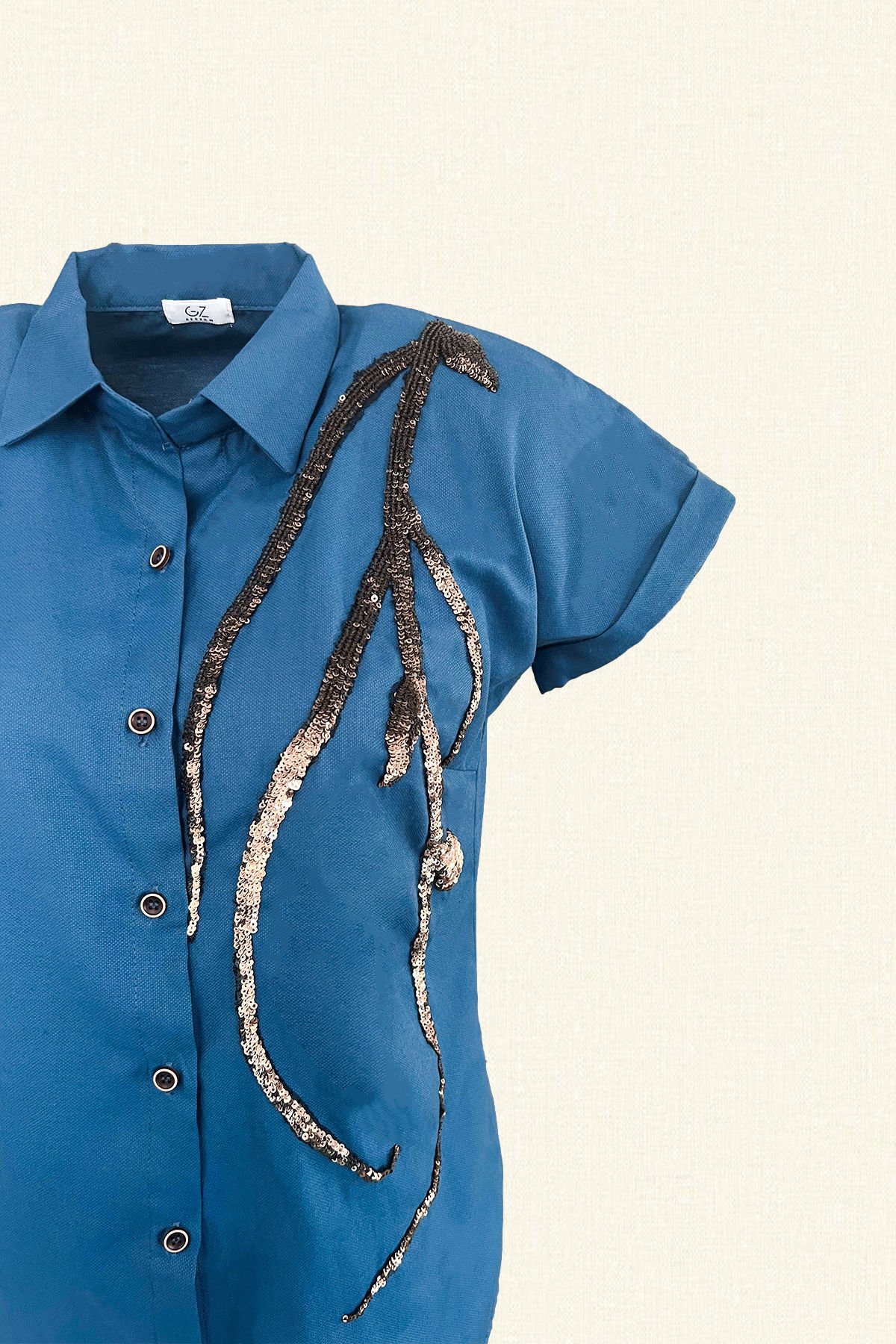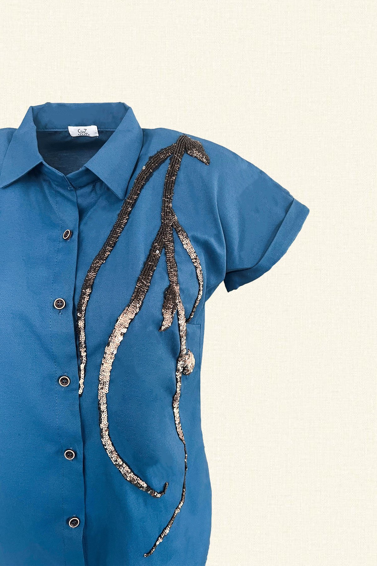 Gömleğin omzundan aşağıya doğru inen gold payetli pul işlemesi bulunan, düşük kollu mavi gömlek.