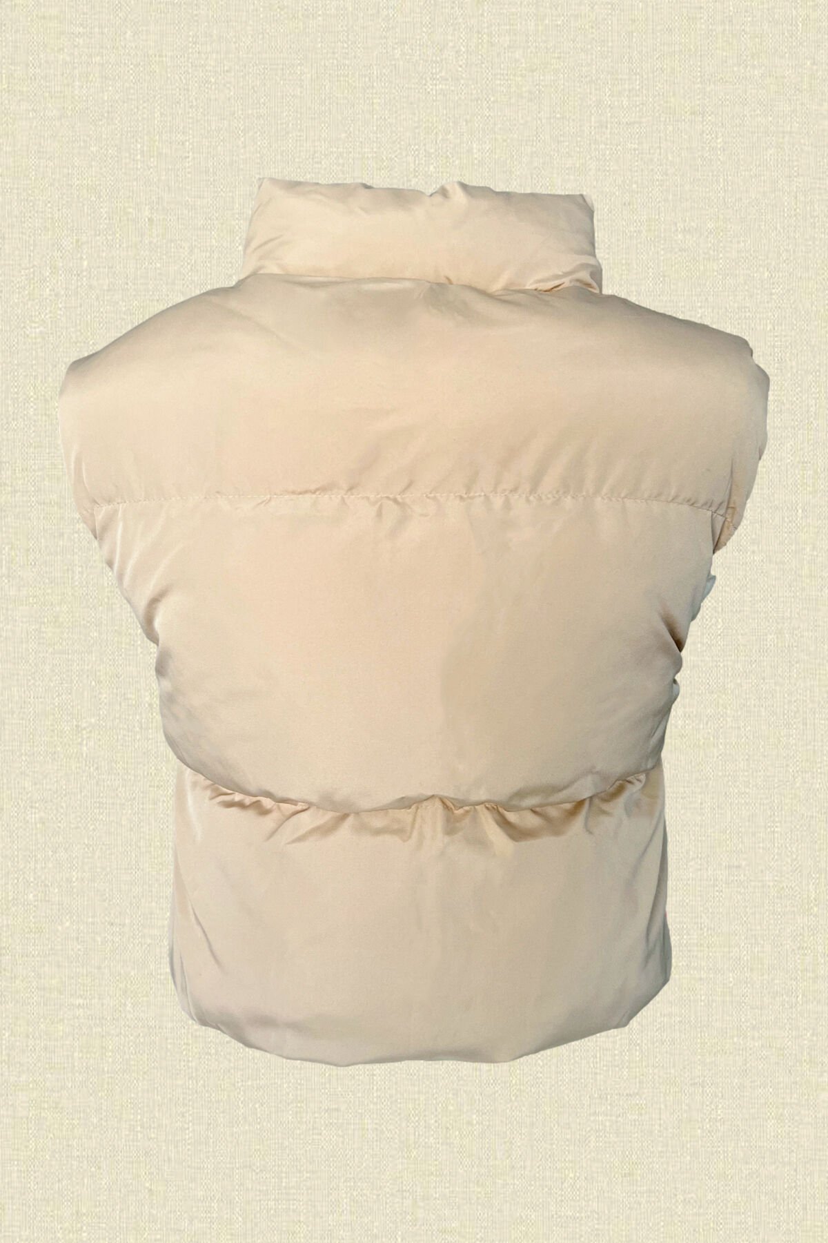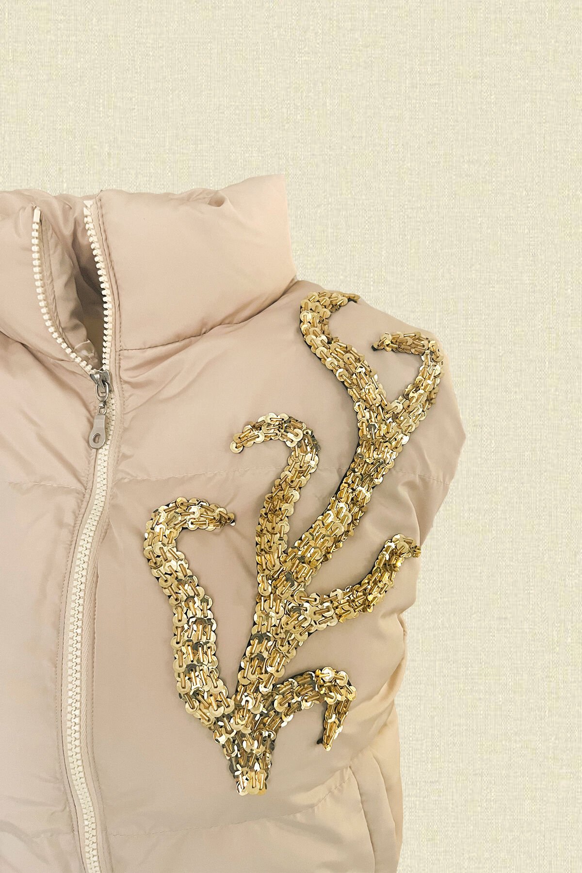 Yaka kısmında pul ve boncuklardan dal işlemeli krem bomber, şişme yelek.