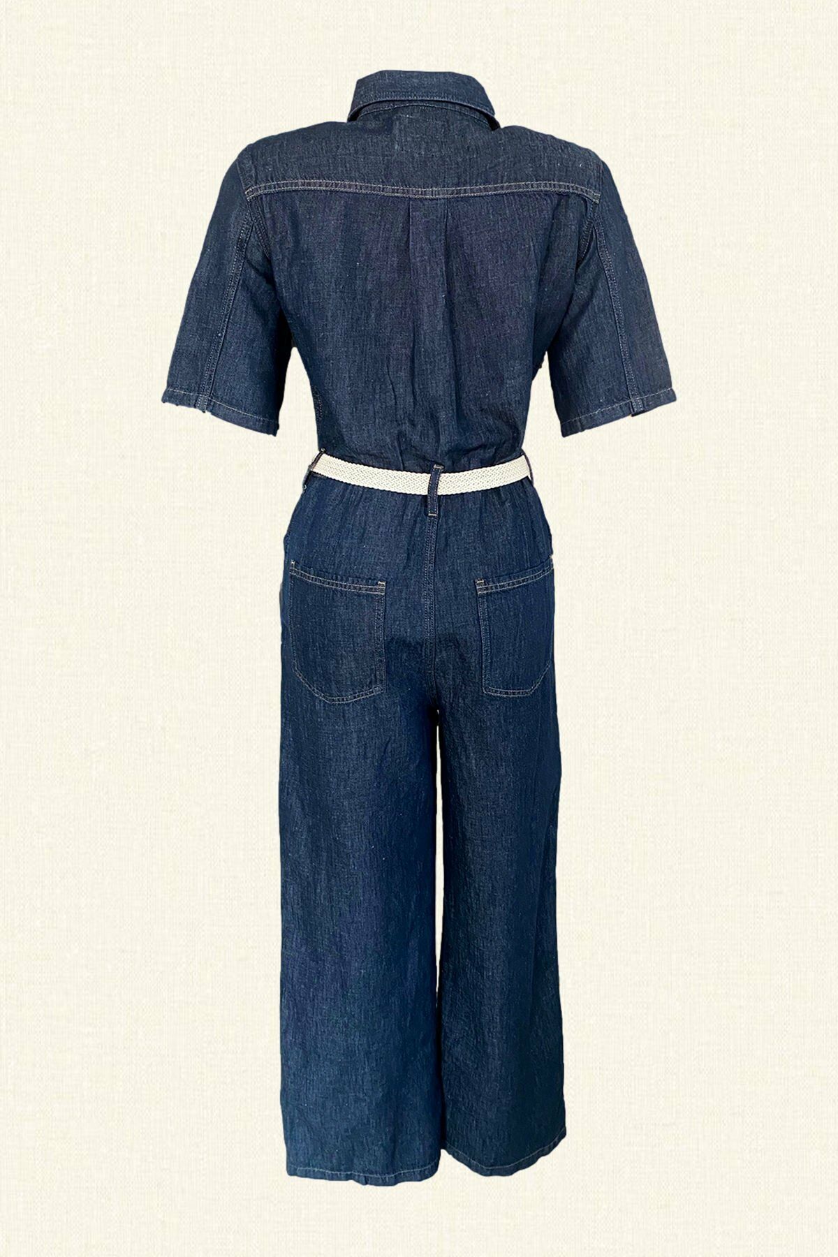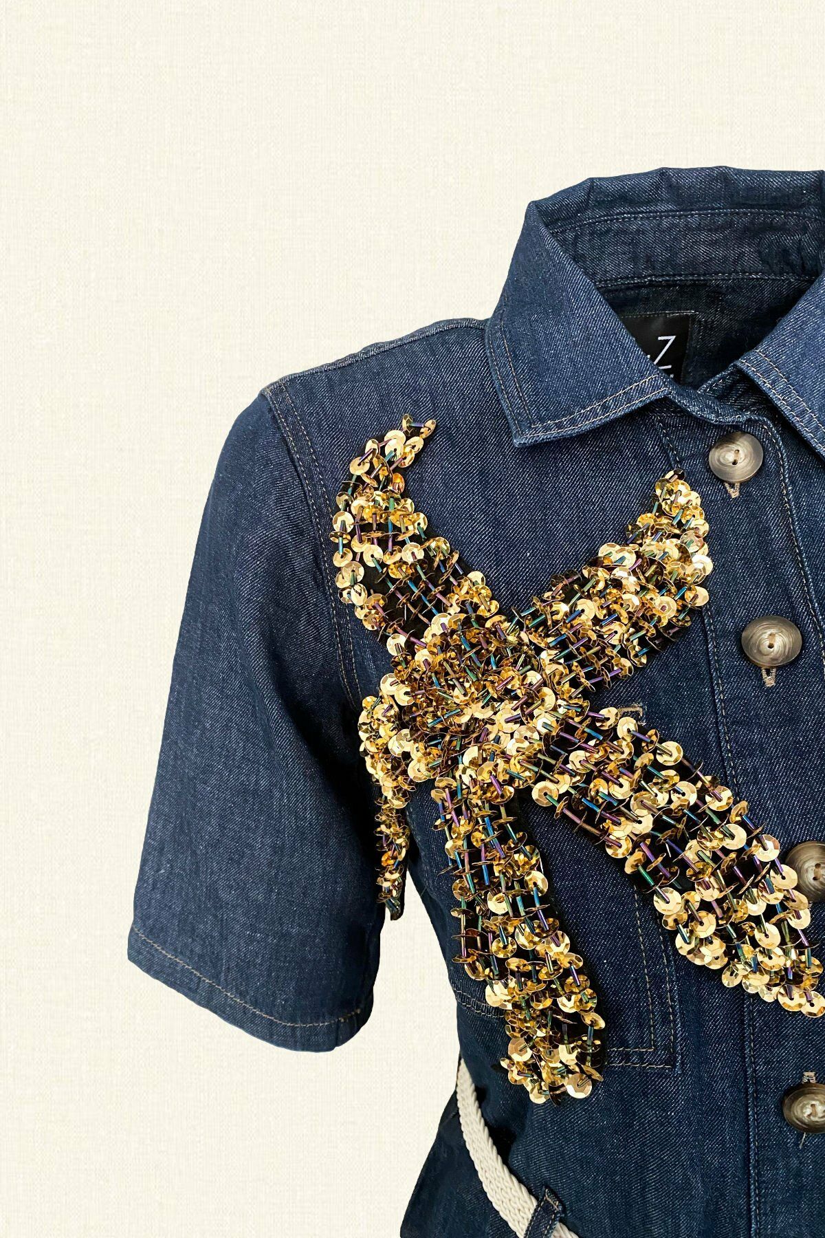 Yakasında boncuk ve pullardan deniz yıldızı motifli, kemer detaylı, bol paça jean tulum.