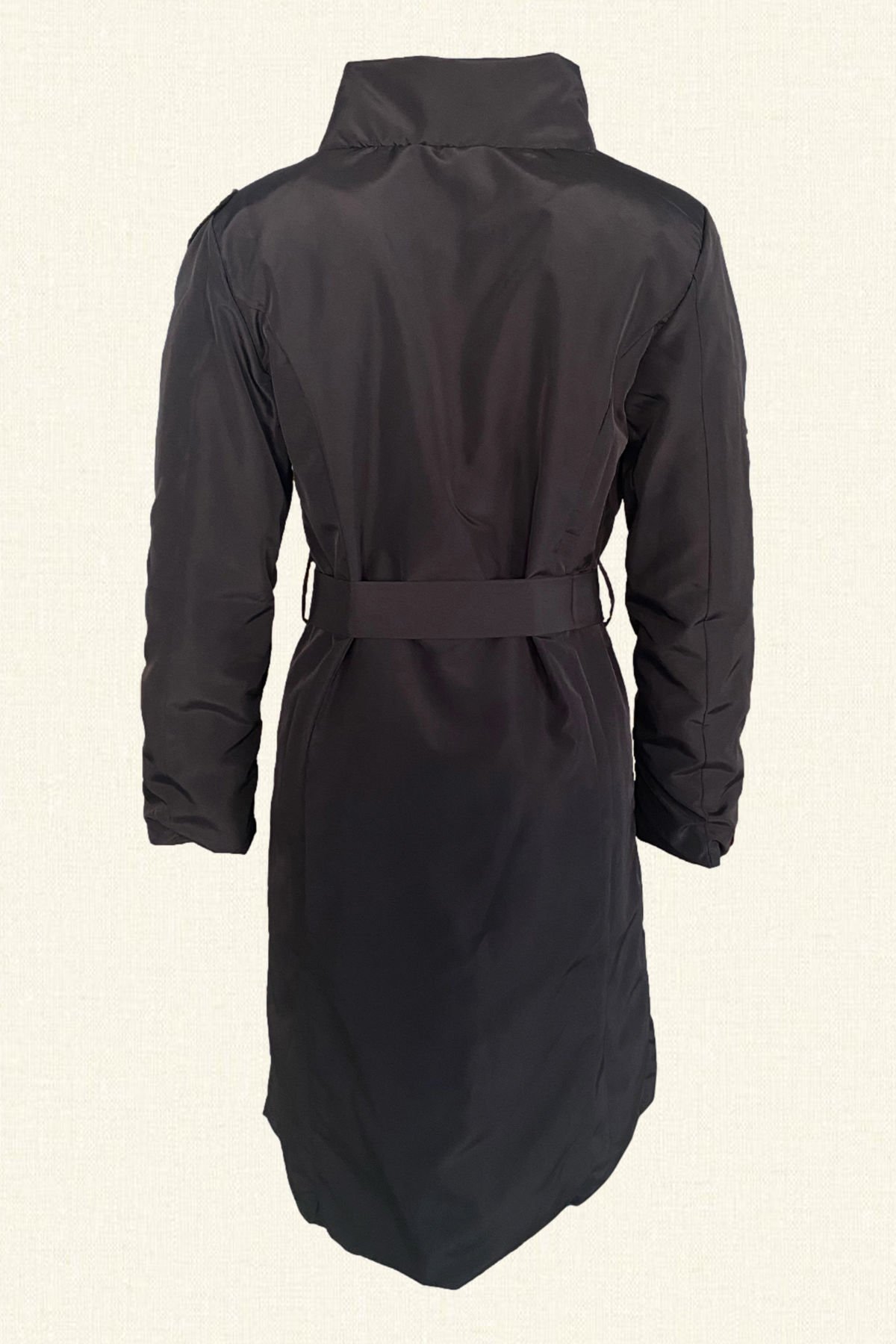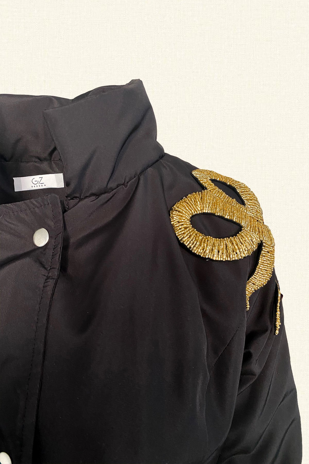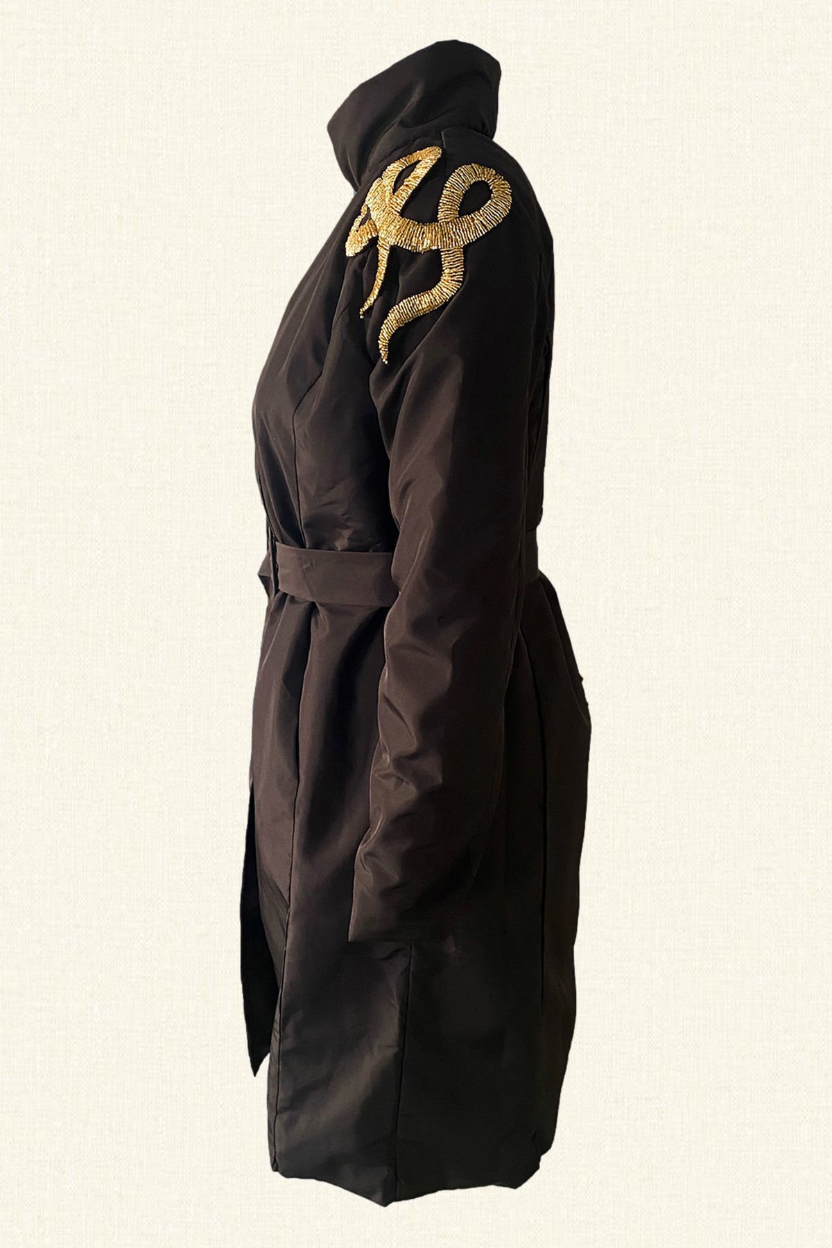 Omuz kısmında sarı boncuklardan halat işlemesi bulunan, kapitone kumaş, beli kemerli ve astar detaylı siyah ince mont.