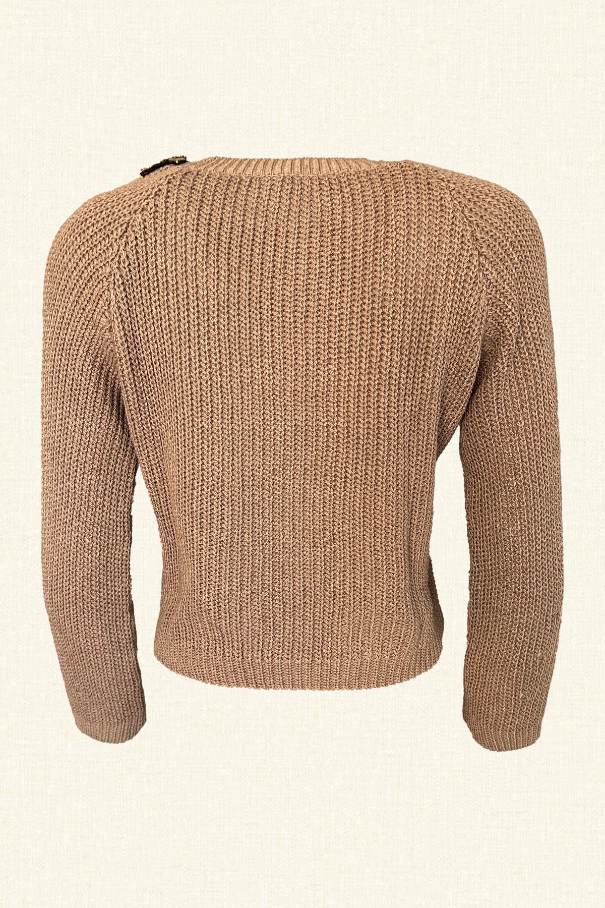 Omuz kısmında gold ve bakır pul, boncuk işlemesi bulunan, kollarında yuvarlak delik detaylı, krem örme triko kazak.
