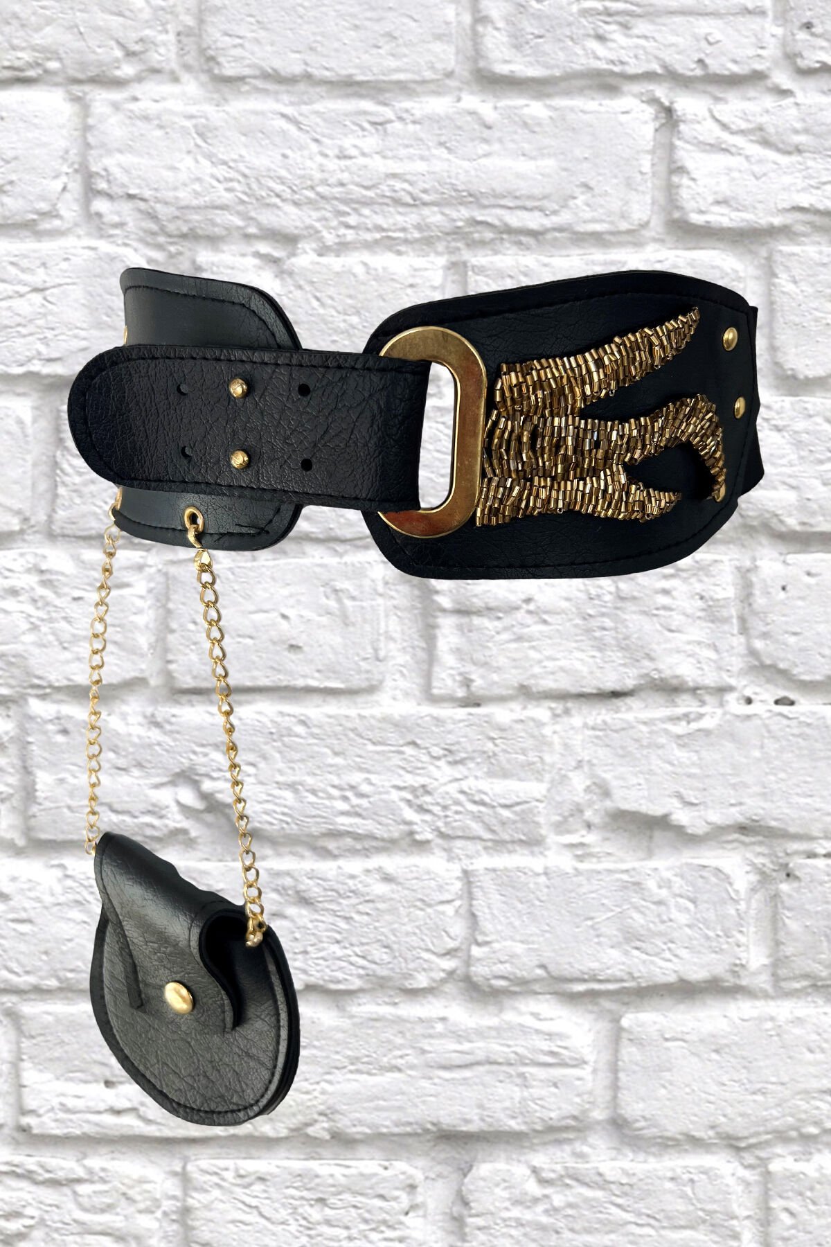 Yan tarafında gold işlemesi bulunan, arka kısmı lastikli, her bedene uygun siyah deri kemer.
